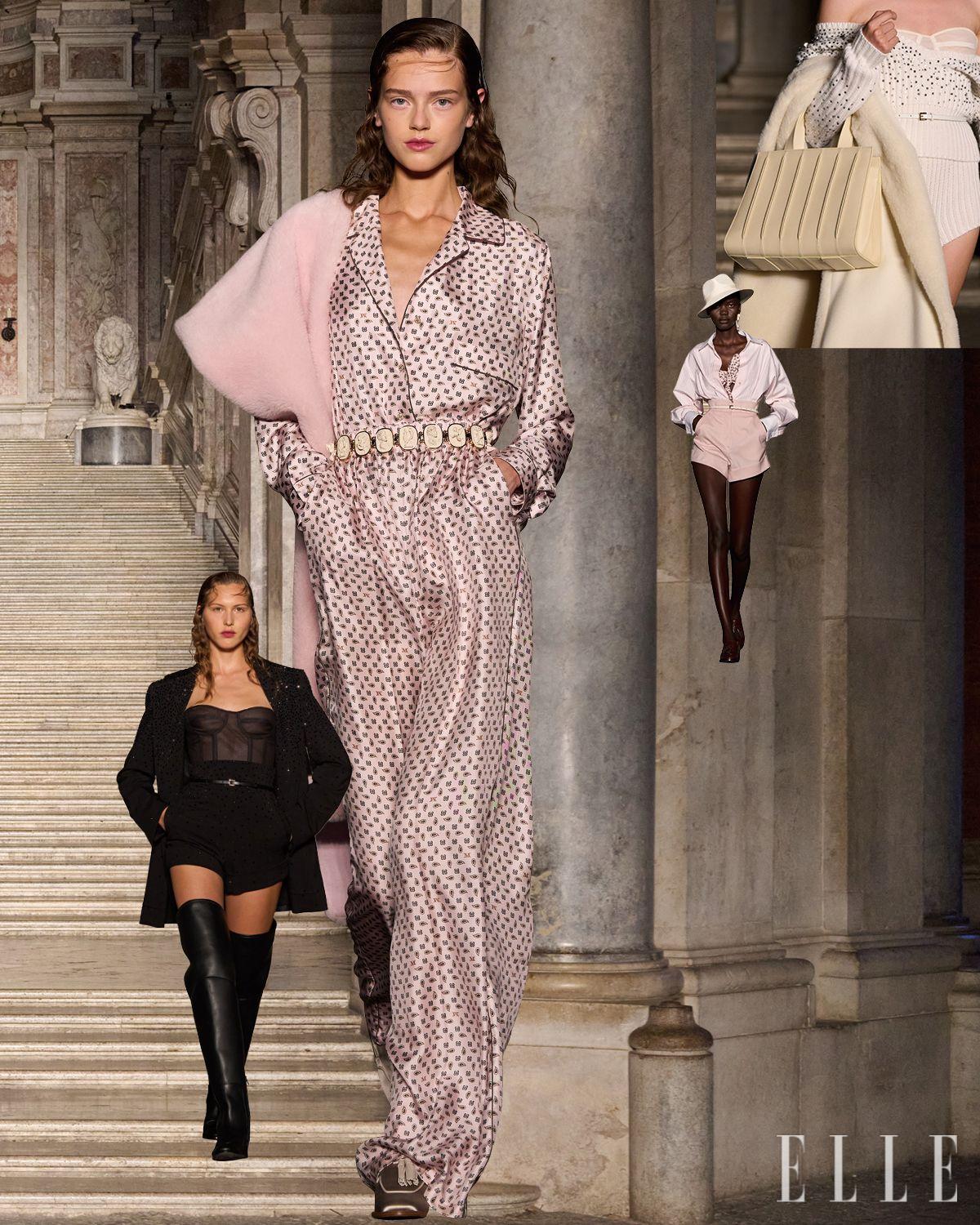 이를 대변하는 아이코닉한 인물 실바나 망가노와 소피아의 상징적인 스타일은 실바노 망가노가 영화 속에서 입었던 대담한 쇼츠, 마름모 포켓이 특징인 풀 서클 스커트, 슬립 드레스 등 관능적인 패션 아이템 등을 컬렉션 곳곳에서 발견할 수 있다. 하우스의 근간이기도 한 코트는 이번 컬렉션에서도 중심축으로 작용한다. 벨트와 프린지, 숄 칼라 등 장식적 요소를 활용해 클래식 코트를 변주했다.