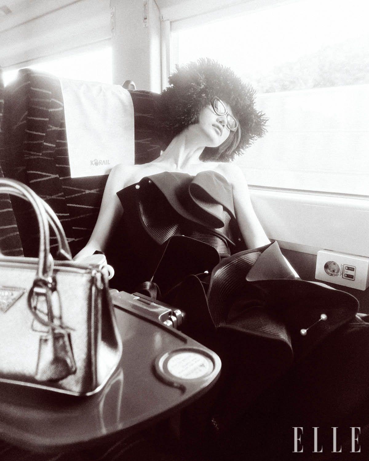 블랙 러플 드레스는 가격 미정, Maticevski by Maison Reve. 실버 컬러 갤러리아 미니 사피아노 가죽 백은 가격 미정, Prada. 볼드한 디자인의 뿔테는 54만5천원, Gucci by Kering Eyewear. 퍼 햇은 가격 미정, Yue Qiqi. 손에 들고 있는 에스프레소 잔은 6만8천원, Nuflaat.