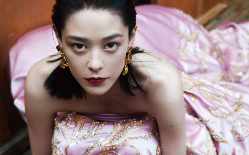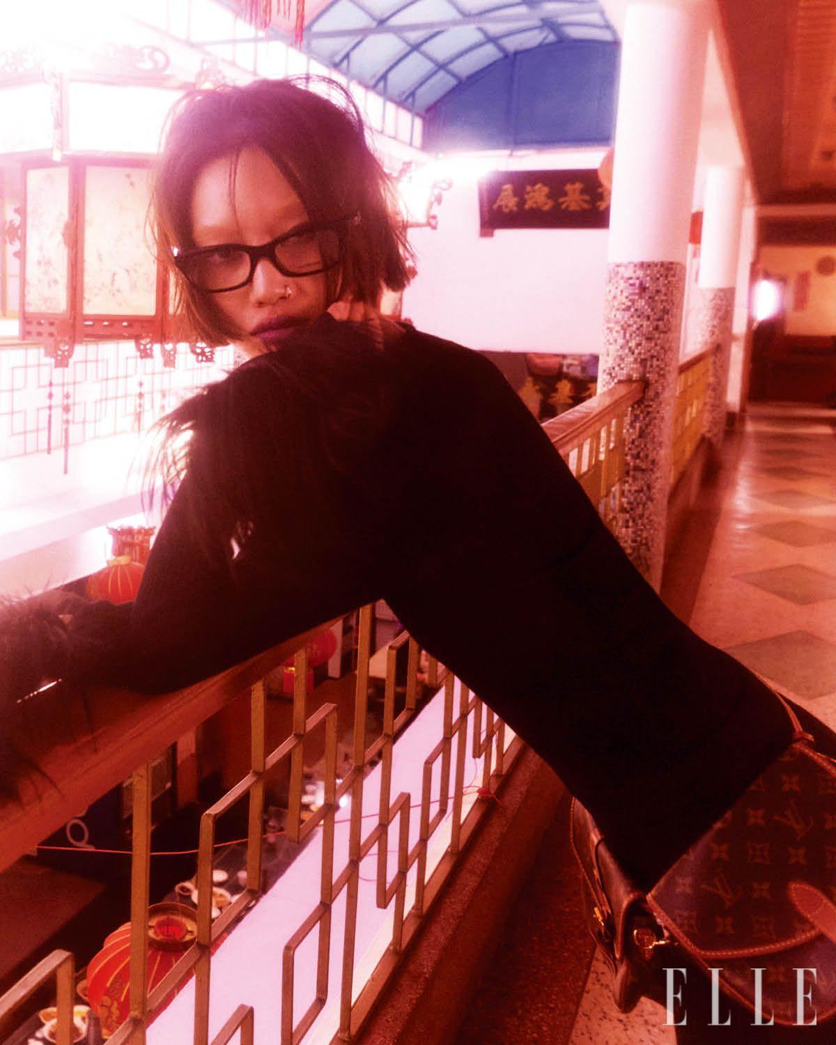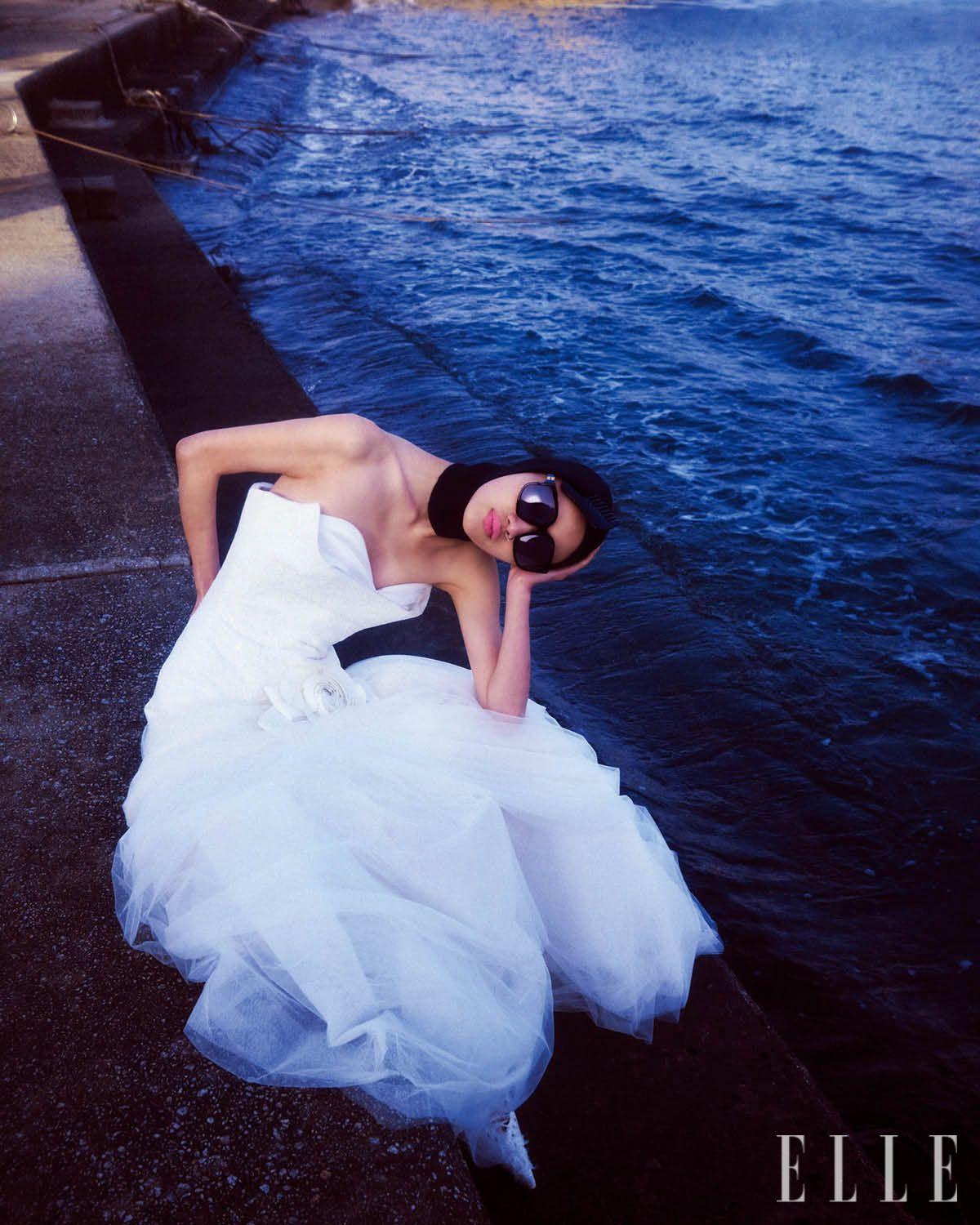 오프숄더 드레스는 가격 미정, Valentino. 메달 모티프의 네크리스는 가격 미정, Balenciaga. 투명한 핑크 프레임의 안경은 49만4천원, Prada byEssilorluxottica. 손목에 낀 리본 장식의 헤어 스크런처는 가격 미정, Dior. GG 크리스털 장식의 타이즈는 가격 미정, Gucci.