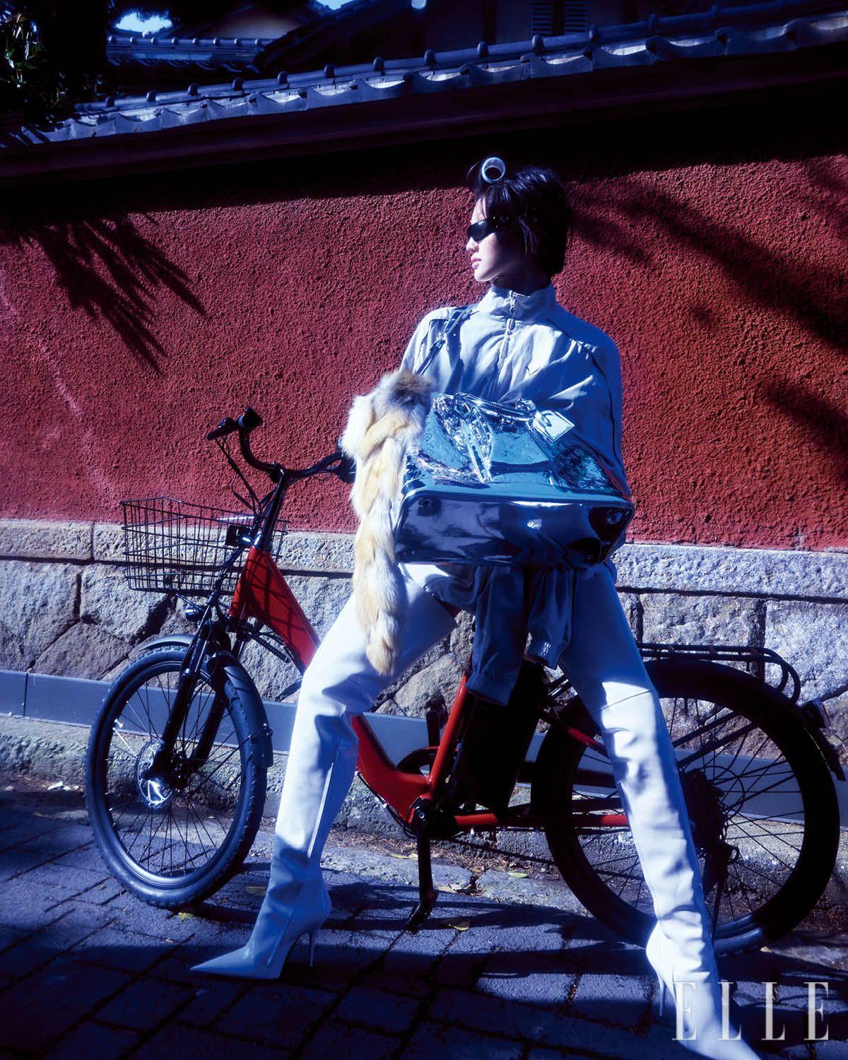 푸마 트랙 수트 재킷과 스커트, 니 하이 부츠는 가격 미정, 모두 Balenciaga. 선글라스는 75만5천원, Gucci by Kering Eyewear. 알마 트래블 백은 가격 미정, Louis Vuitton. 가방에 장식한 페이크 퍼 머플러는 가격 미정, Markgong.