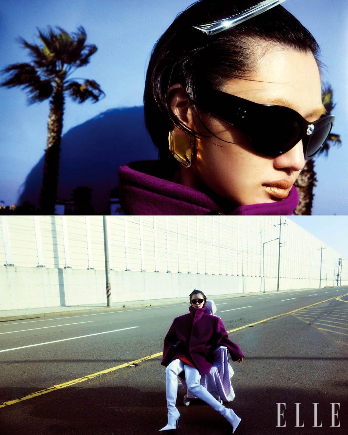 코트와 스커트, 선글라스, 이어링은 가격 미정, 모두 Saint Laurent by Anthony Vaccarello. 오버 니 하이 부츠는 가격 미정, Balenciaga. 머리 빗은 에디터 소장품.