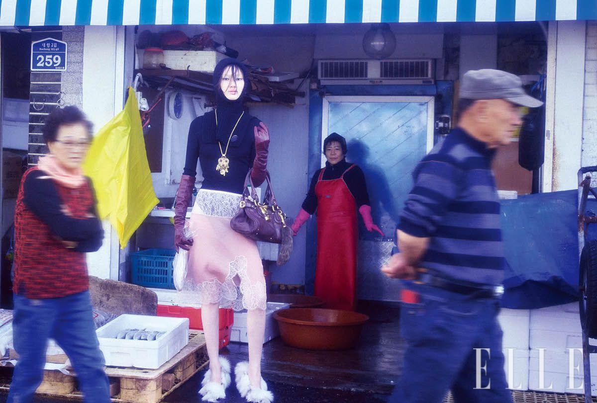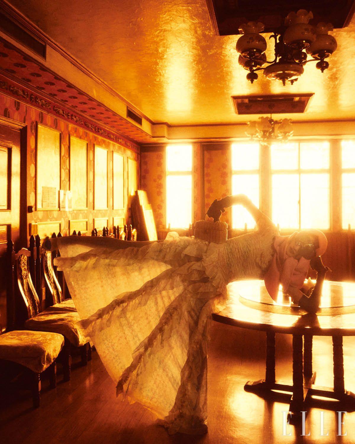 러플 드레스는 가격 미정, Chanel. 새틴 뮬은 가격 미정, Gucci. 고글은 1백17만5천원, Balenciaga by Kering Eyewear. 핑크 스카프는 59만원대, N°21. 니트 글러브와 블루 컬러 양말은 가격 미정, 모두 Shu Shu/Tong.
