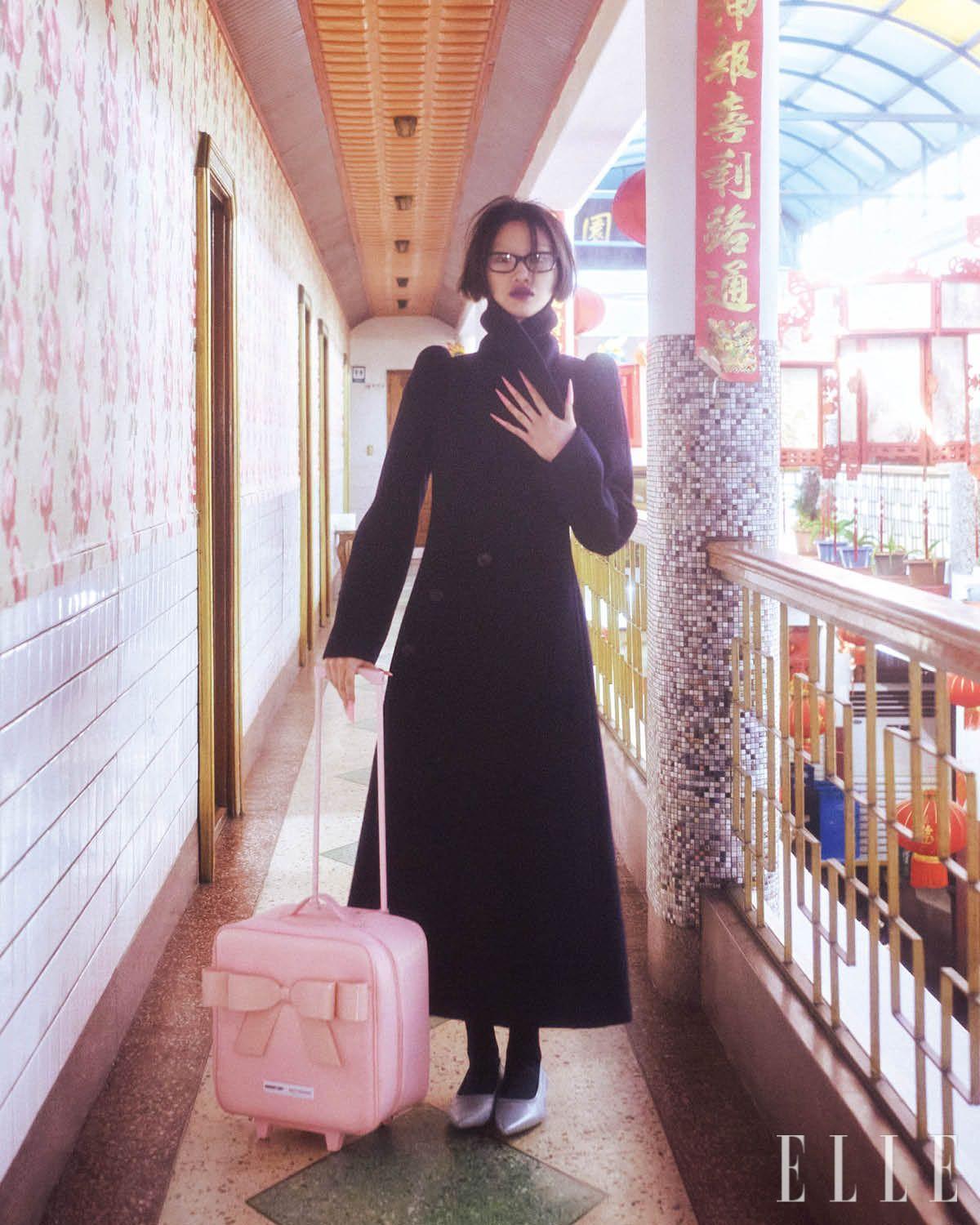 유니크한 셰이프의 코트와 타이즈는 가격 미정, 모두 Alaïa. 플랫 슈즈는 가격 미정, Acne Studios. 스퀘어 프레임의 안경은 50만원, Balenciaga by Kering Eyewear. 리본 장식의 캐리어는 가격 미정, Haus Nowhere × Shushu/Tong.