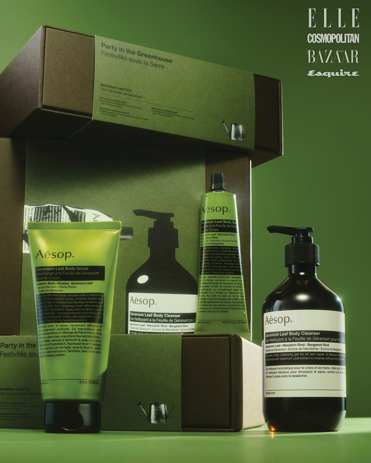 그린 아로마의 생기가 오롯이 느껴지는 보디 케어 3종. 산뜻한 클렌저, 부드러운 스크럽, 풍부한 영양의 보디 밤으로 구성되었다. 파티 인 더 그린하우스 14만1천원 AESOP.