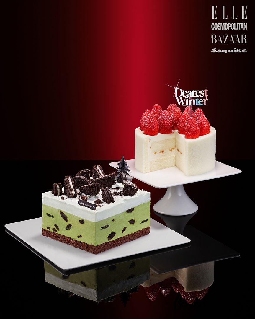 순백의 엔젤 시폰 시트 위에 화이트 초코 생크림을 올렸다. 고소한 아몬드 크런치가 씹히는 화이트 스초생 케이크는 3만9천원, 진한 말차 마스카포네 크림과 블랙 초코 쿠키, 말차 가나슈가 조화를 이루는 말차 아박 홀케이크는 3만5천원 A TWOSOME PLACE.