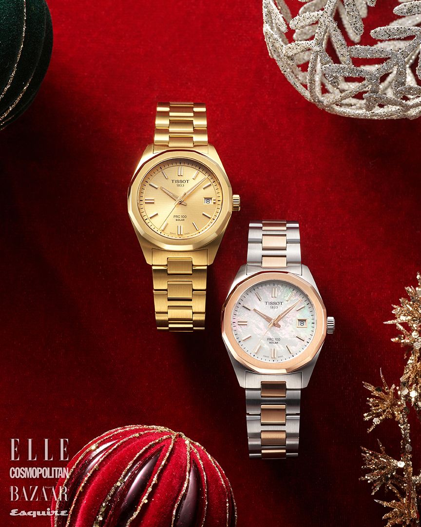 티쏘만의 혁신적인 라이트마스터 솔라 테크놀로지를 탑재해 유니섹스 사이즈인 34mm로 출시한 PRC 100 SOLAR 컬렉션. 옐로 골드 워치와 로즈 골드 워치는 모두 가격 미정 TISSOT.