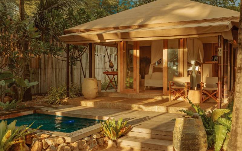 태국 전통 장식을 현대적으로 재해석한 객실 내부.