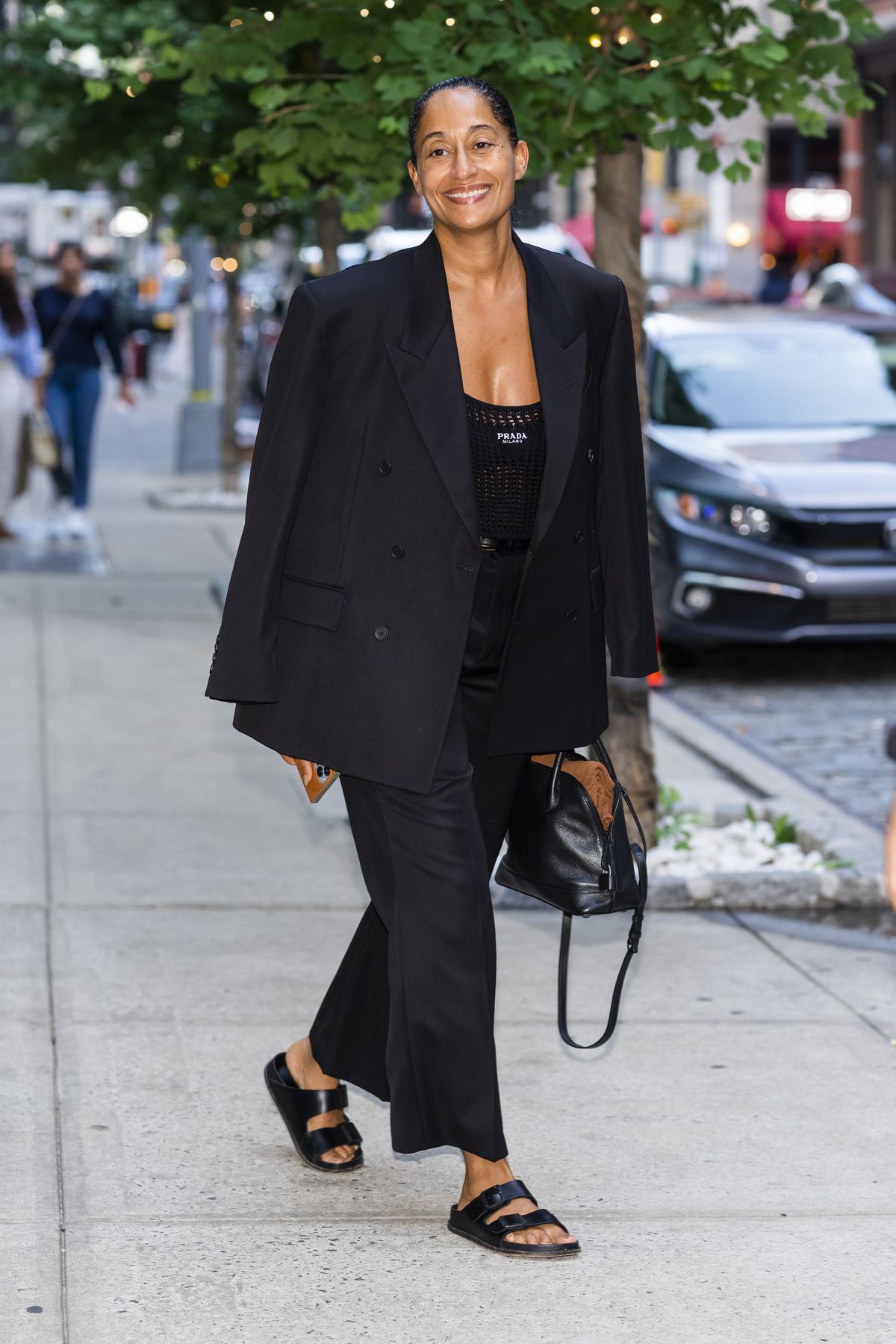 트레이시 엘리스 로스처럼 버켄스탁에 확실한 포인트 아이템 하나만 더해도 룩 전체의 무드는 완전히 달라집니다. 멋스러운 테일러링이 돋보이는 블레이저와 슬림한 테이퍼드 팬츠, 구조적으로 정제된 돔 백은 자연스러우면서도 도시적인 분위기를 자아내죠. 칵테일 파티부터 조용한 데이트까지 무리 없이 소화할 수 있고요. 이 때 스웨터 대신 과감한 포인트 톱을 선택하면 룩 전체의 무게감이 한층 가벼워지고, 세련된 여유가 자연스럽게 흘러나오죠.