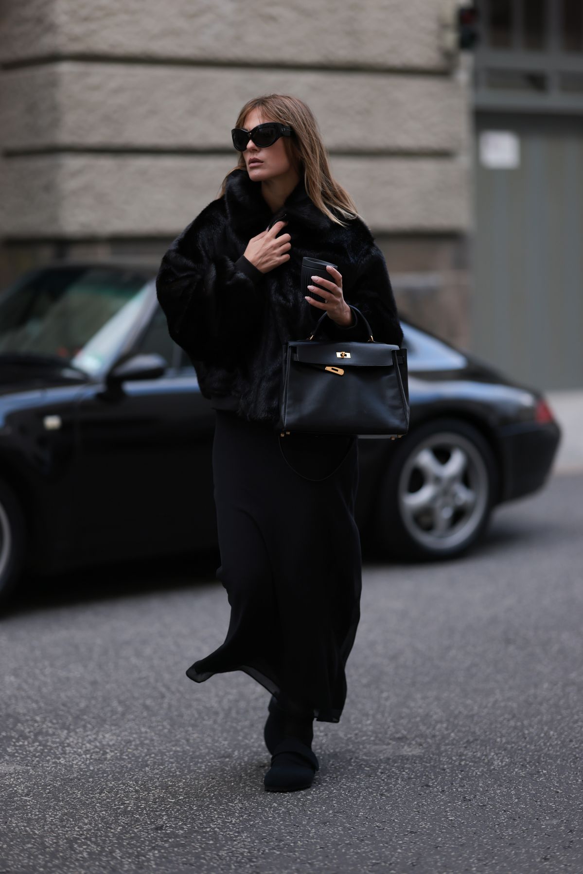 올 블랙은 그 자체만으로도 강렬한 미니멀리즘의 정수를 보여줍니다. 올 블랙이 겨울에 특히 더 빛나는 이유는 다양한 소재가 서로 충돌하지 않고, 오히려 조화롭게 어우러져 한층 더 고급스러운 분위기를 자아내기 때문이죠. 페이크 퍼 재킷은 도시적인 무드와 드레시한 무드를 자유롭게 넘나들며, 번화가와 갤러리 그 어느 곳에서든 자연스러운 존재감을 드러냅니다. 여기에 실키한 맥시 스커트를 더하면 우아한 실루엣이 극대화되죠. 둥근 프레임 선글라스와 구조적인 탑 핸들 백, 골드 이어링까지 더하면 룩 전체가 완성형 미니멀리즘으로 들어서게 됩니다. 버켄스탁도 우아할 수 있다는 사실을 가장 잘 보여주는 조합이죠.