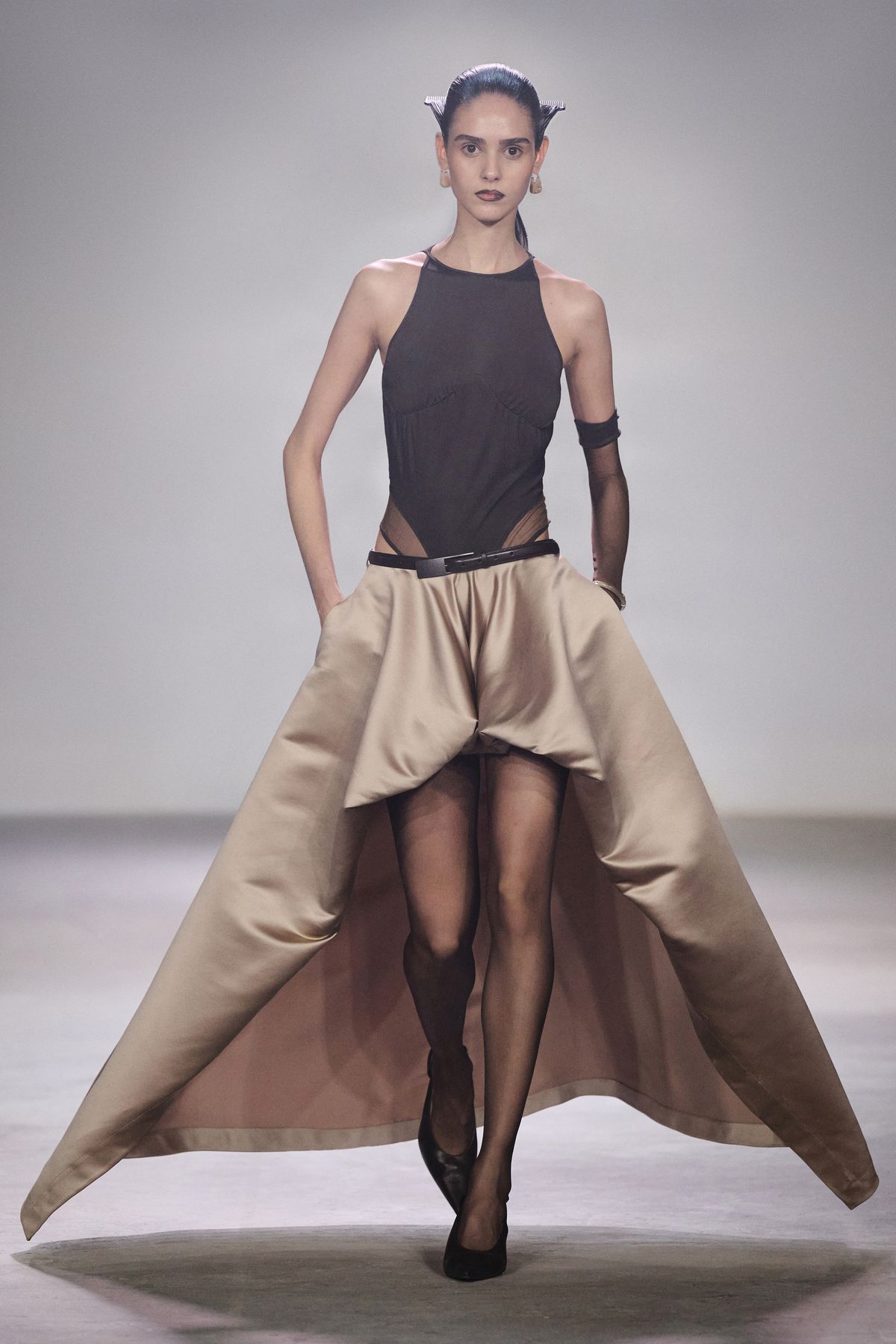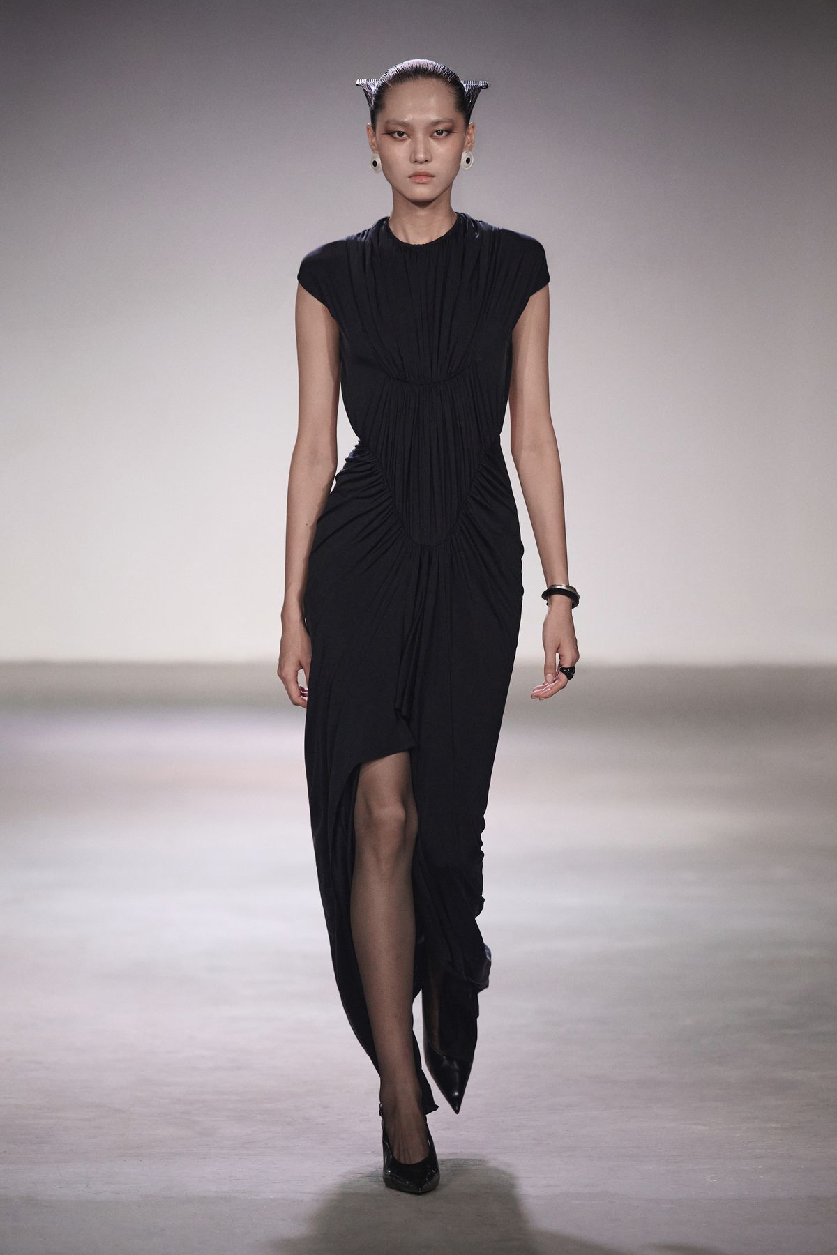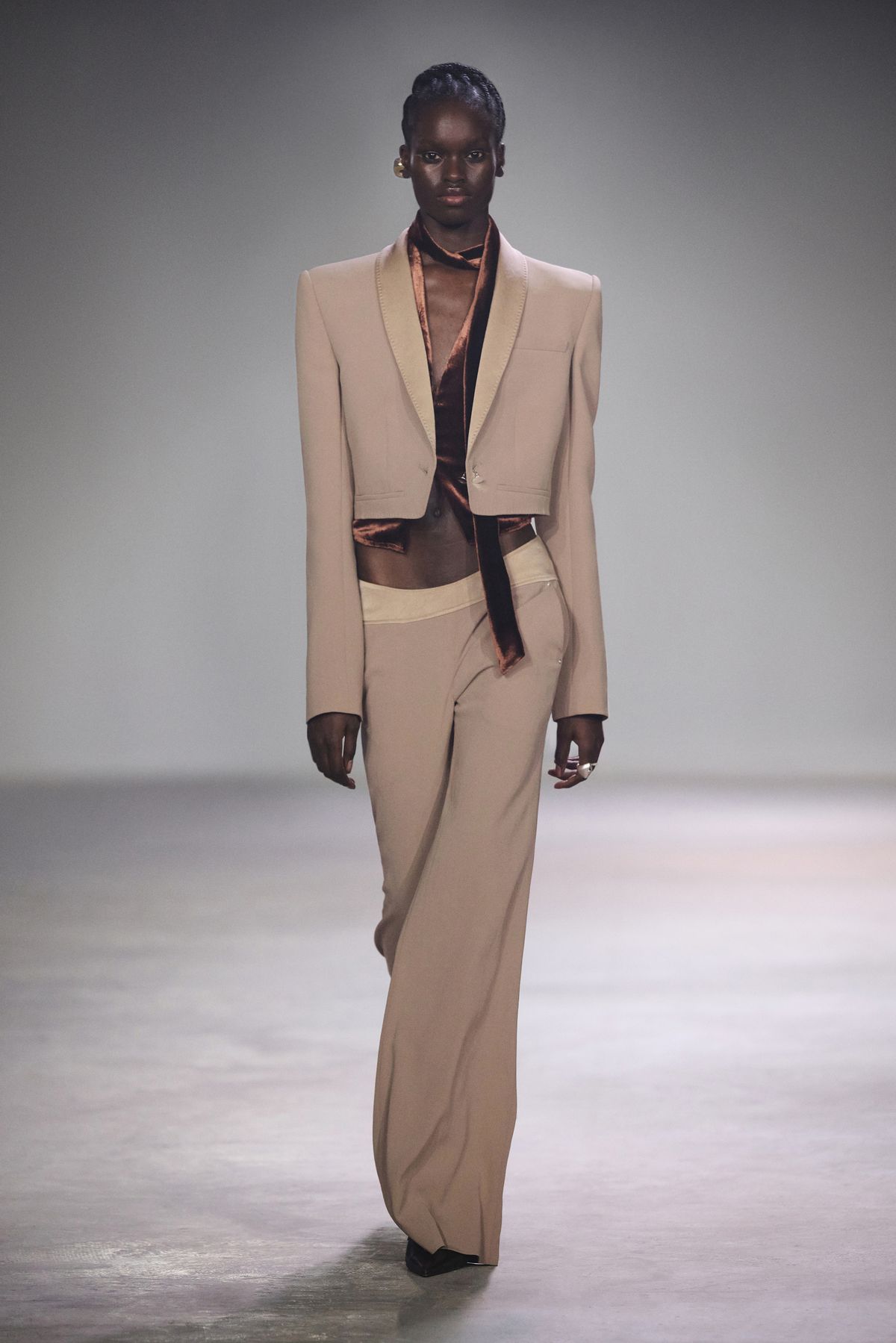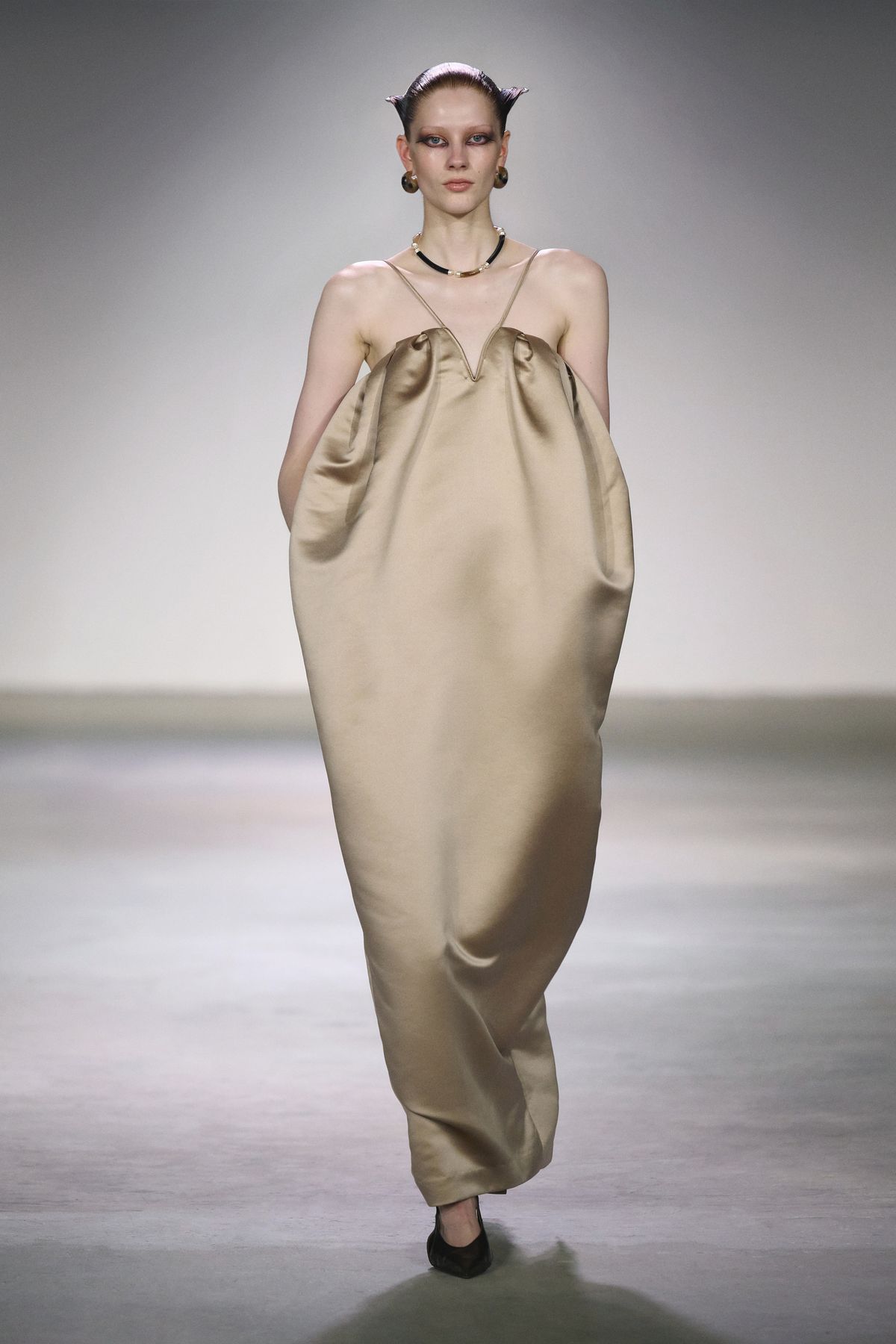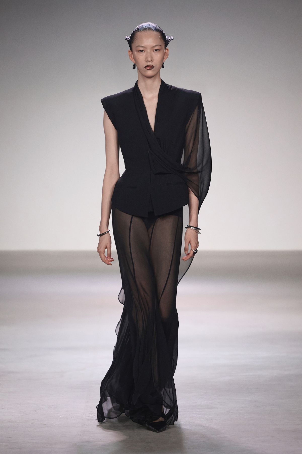 이번 시즌은 쇼 공간에서 출발했다. 육각형 기둥들로 가득한 홀, 그 구조가 시야를 여러 조각으로 나누고 있었다. 평소처럼 비어 있는 무대를 택하는 대신, 기둥을 거울로 감싸 반사와 굴절을 이용한 착시를 만들었다. 마치 우리가 SNS 시대 속에서 왜곡된 자아와 사회의 이미지를 마주하는 것처럼. 이번 컬렉션은 그런 ‘미라주(환영)’ 속의 현실을 담았다.
