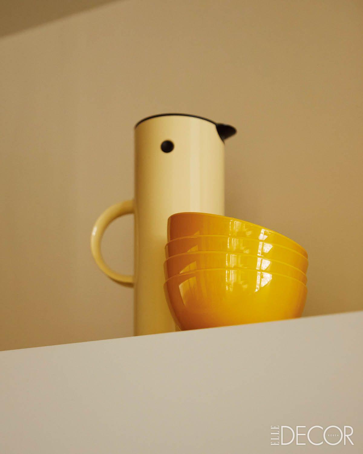 집을 고치는 일은 그녀에겐 ‘자신’을 알아가는 과정이기도 했다. “제가 무채색을 좋아한다고 생각했어요. 그런데 집을 고치며 내가 얼마나 색을 좋아하는지 알게 됐죠.” 진한 초콜릿 컬러와 엷은 블루 컬러의 몸체에 패턴이 진한 천연 대리석을 올려 만든 부엌 가구부터 노란색으로 통일한 USM 수납장, 헬라 융게리우스 디자인의 블루 계열 비트라 소파 ‘폴더(Polder)’까지. 풍성하고 다채로운 색과 형태가 오래전부터 이곳에 호흡을 맞춘 듯 자연스럽게 어우러진다. “벽면은 녹색 물감이 한 방울 떨어진 듯한 엷은 셀러리 톤이에요. 다른 색들을 잘 품어줘 집 전체가 하나의 큰 배경처럼 느껴져요.” 공간에 대한 그의 감각은 단순한 미적 취향이 아니라 살아온 시간의 결과다. “어릴 때부터 제 방은 늘 실험 공간이었어요. 아버지가 지은 집이었는데, 이사 가던 순간을 잊을 수 없어요. 아버지는 제 방 벽지부터 제가 직접 고르게 하셨어요. 우리 집은 항상 깨끗하고 단정했고, 종종 가구를 옮기고, 커튼을 바꾸면서 다채롭게 변했어요.” 직접 벽지를 골랐던 방, 끊임없이 바뀌던 본가의 풍경은 ‘공간의 주인’이 되는 연습이기도 했다. 그런 습관은 독립 이후에도 이어져 오피스텔 페인트 칠부터 처음 장만한 화이트 톤의 가구 조합까지 스스로 해냈다. “그때부터 집은 에너지의 원천이었어요. 공간이 정돈돼야 마음도 정리됐거든요.”