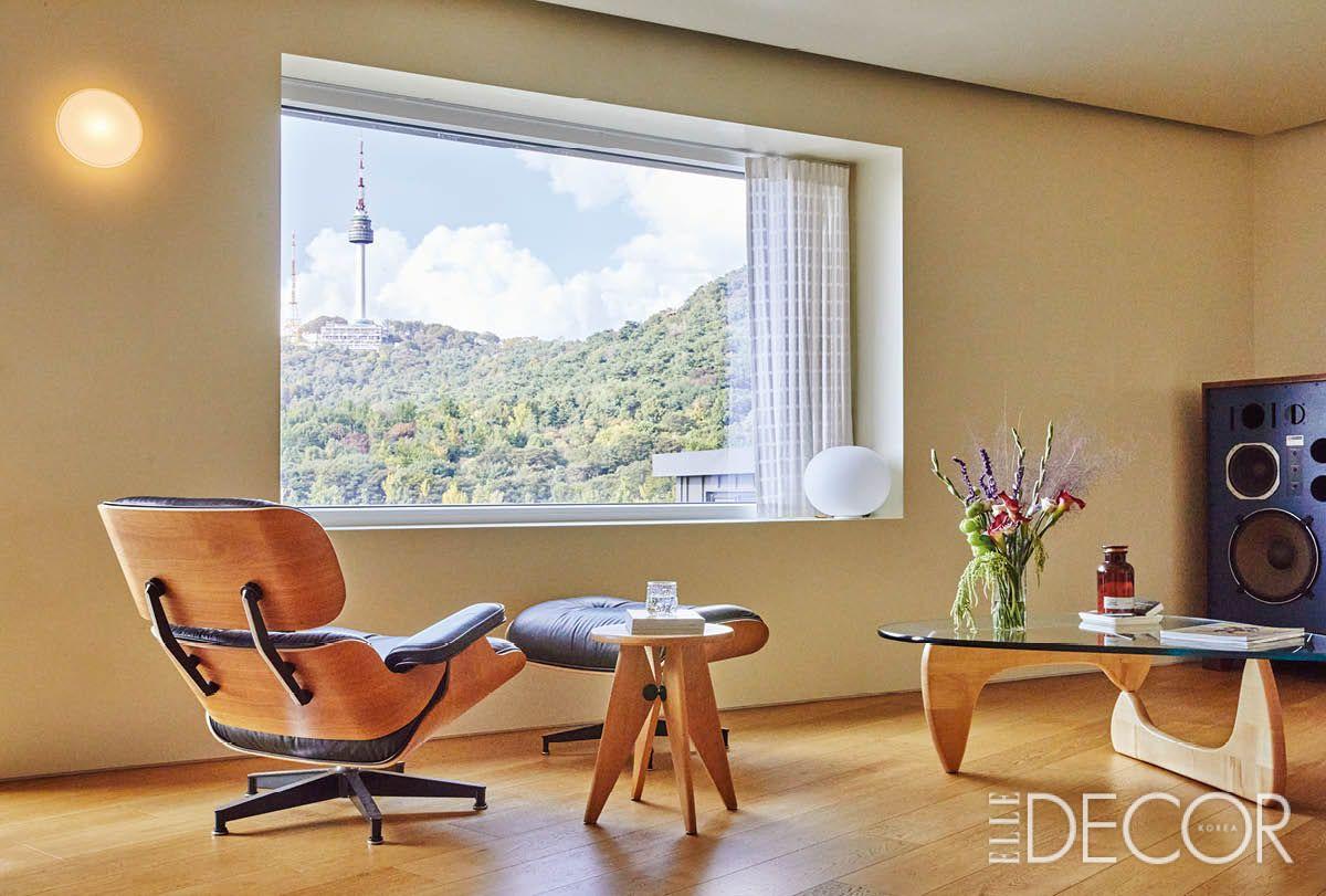 소파와 라운지 체어, 벽면을 가득 채운 서가와 바이닐 존까지 네 가지 전경으로 담아낸 거실. 가족이 각자의 즐거움을 누릴 수 있는 공간이다. 액자처럼 낸 창으로 남산과 하늘 전망을 만끽할 수 있다.