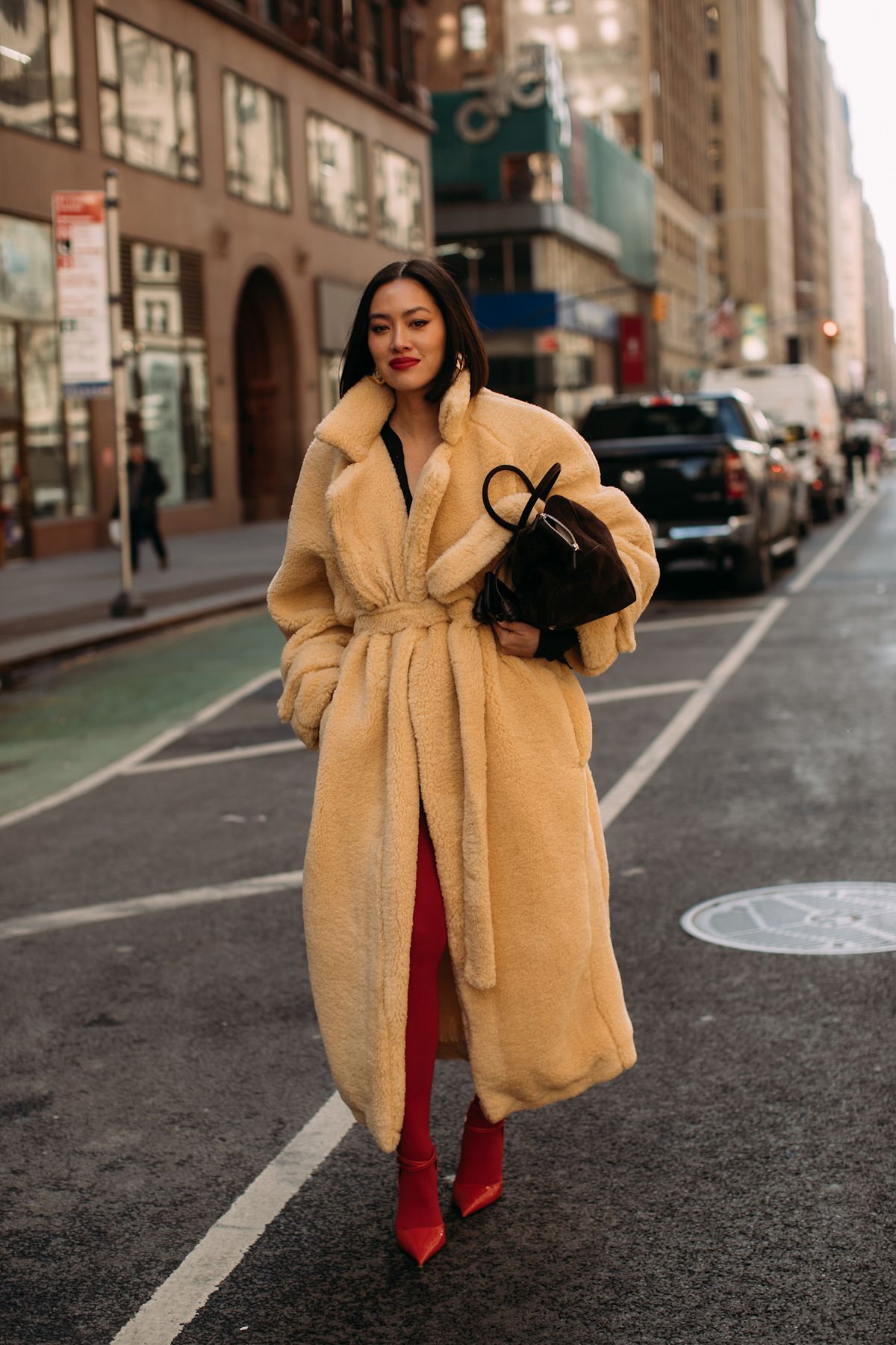 레드의 과감함이 조금은 낯선 미니멀리스트라면, 차분한 그레이 코트나 데님 룩에 레드 타이즈와 메리제인 슈즈를 매치해 감각적인 ‘한 끗’ 포인트를 더하는 것도 훌륭한 전략이 될 수 있어요.