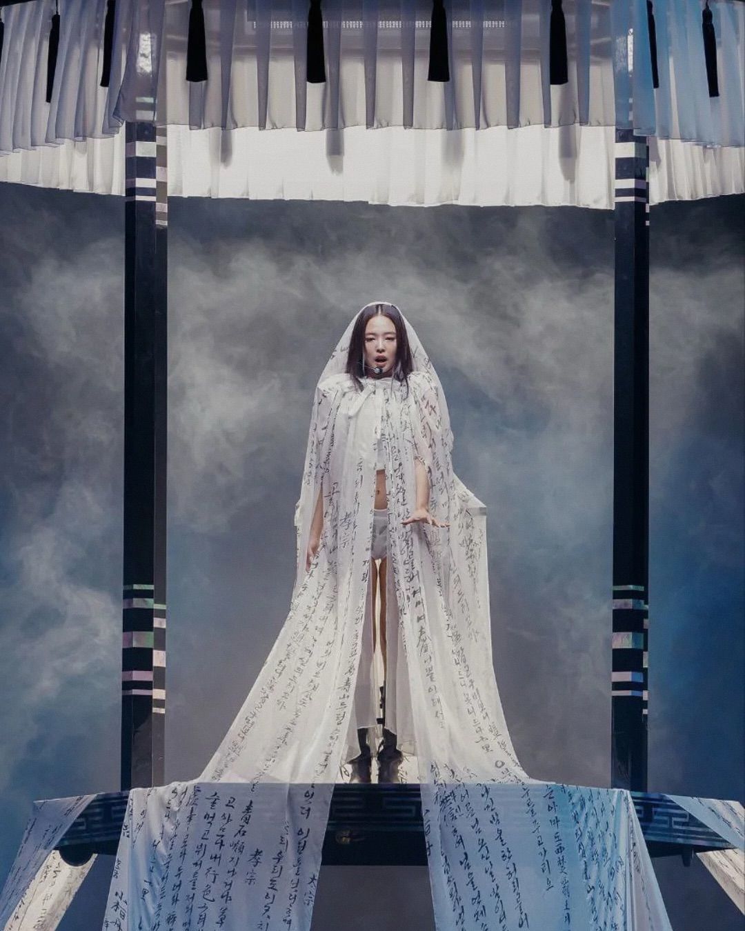 시작은 <Seoul City>였습니다. 몽환적으로 울려 퍼지는 음악과 함께 무대 위에 드리워진 건 다름 아닌 약 15미터에 달하는 베일이었죠. 베일에는 한글로 기록된 최초의 노래 가사집 『청구영언』의 구절이 새겨져 있었습니다. 단순히 얼굴을 가리기 위한 액세서리가 아닌, 자신의 기원과 마주하는 장면을 극적으로 시각화한 장치였죠. 여기에 반가사유상 복식에서 영감을 받은 구조적인 어깨 라인의 가운과 장인의 손길이 깃든 병아리 매듭 노리개를 더해 고요하면서도 단단한 아름다움을 표현했습니다. 저고리 형태에서 착안해 현대적으로 재해석한 제니와 댄서들의 의상은 무대 전반에 한국적인 미학을 한가득 수놓았고요.