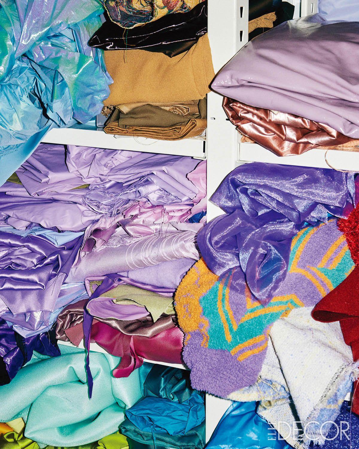 각종 바느질 재료가 색깔별로 모여 있는 작업 공간. 다리미판 위에는 아직 완성되지 않은 조각의 일부가 가지런히 쌓여 있다. 패브릭 표면에는 꽃잎이나 곤충의 날개, 물고기의 지느러미처럼 다양한 생물의 신체적 형태에서 착안한 패턴을 새겼다.