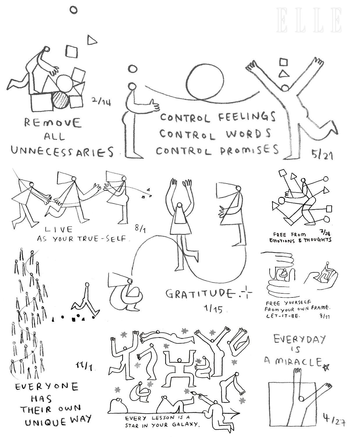 드로잉에 포함된 문구들은 담담한 자기고백 같기도, 다정한 조언 같기도 하다. 독자에게 건네고 싶은 말이 있다면