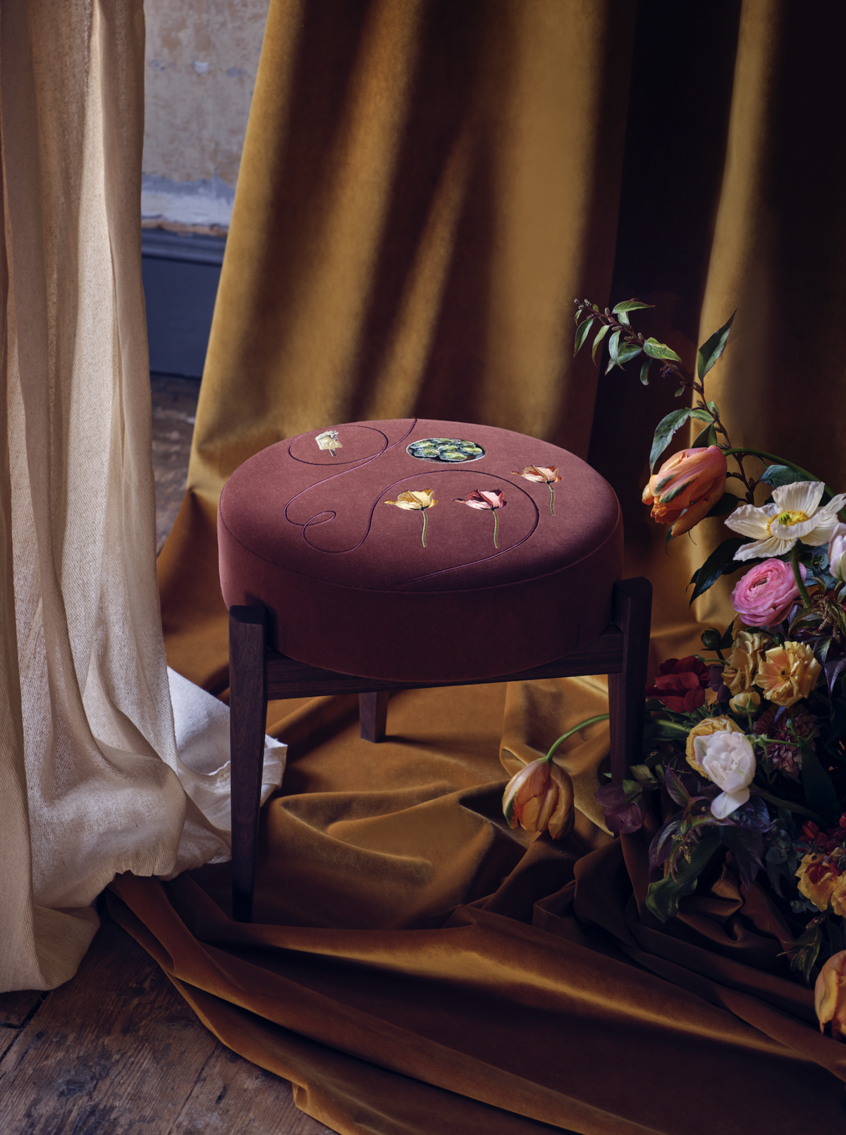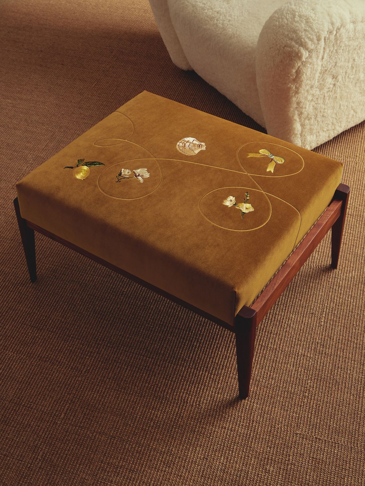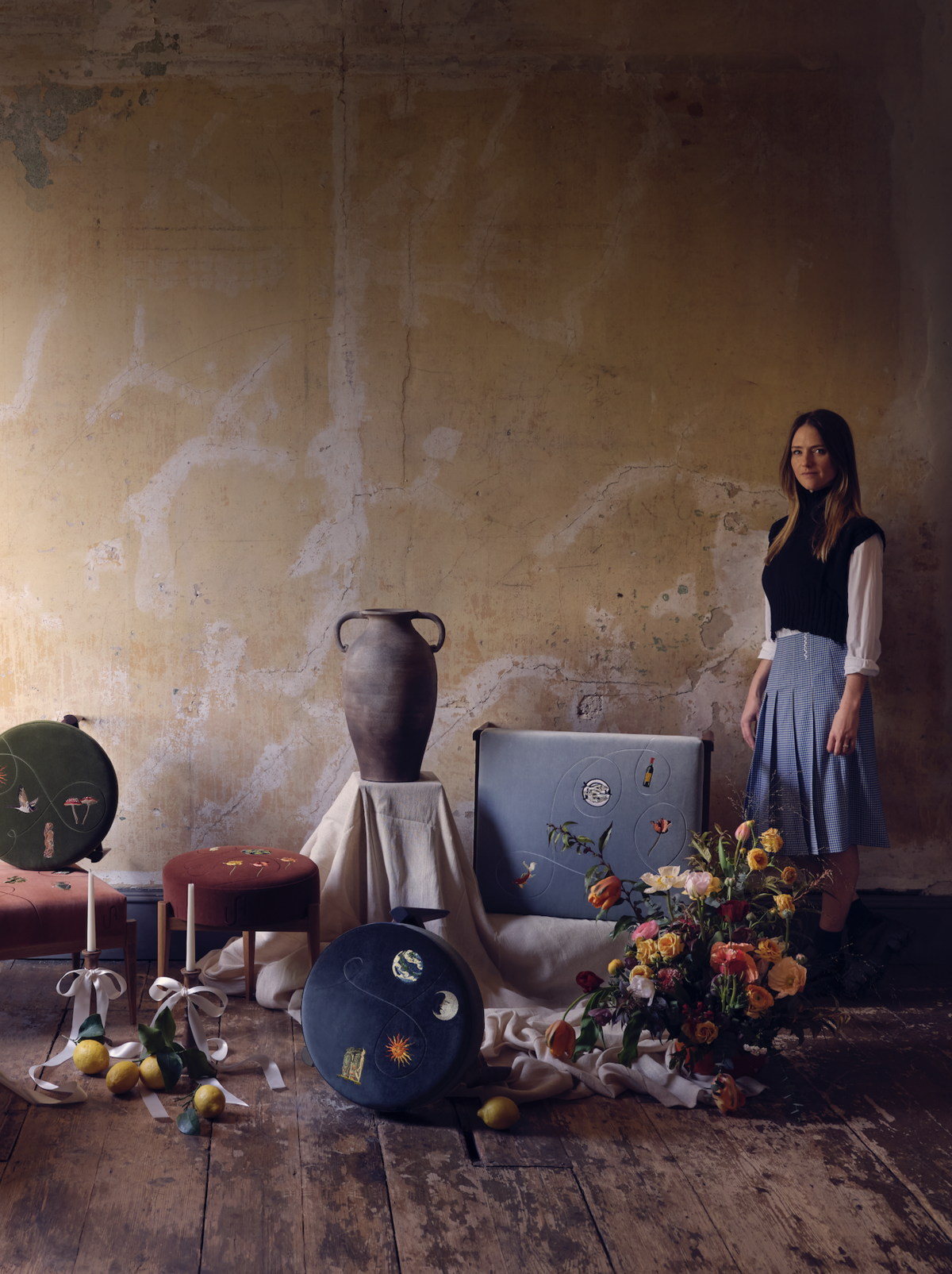 먼저 클라이언트와 상담을 진행한 뒤, 손으로 그린 드로잉으로 디자인을 구체화합니다. 모티프가 확정되면 자수 작업으로 옮겨 런던 소호에 있는 제 스튜디오에서 제작하고요. 이후 프레임 제작과 업홀스터리는 이스트 런던의 소규모 공방들과 협업해 마무리합니다. 이렇게 디자인–자수–구조와 마감이 단계적으로 이어지며 한 점의 의자를 완성해요.