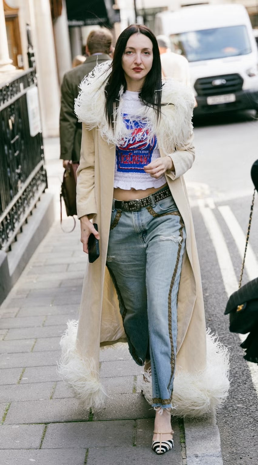 코트는 단순한 방한 아이템이 아니라, 충분히 스타일의 중심이 될 수 있습니다. 1970년대 부두아를 연상시키는 과감한 무드의 코트를 선택해보세요. 여기에 그래픽 티셔츠와 프린트 뮬을 더하면, 데님은 자연스럽게 캔버스 역할을 하게 되죠. 레이스 트리밍처럼 디테일이 살아 있는 청바지를 고르면, 일상적인 아이템도 한층 오트 쿠튀르적인 분위기로 끌어올릴 수 있습니다.