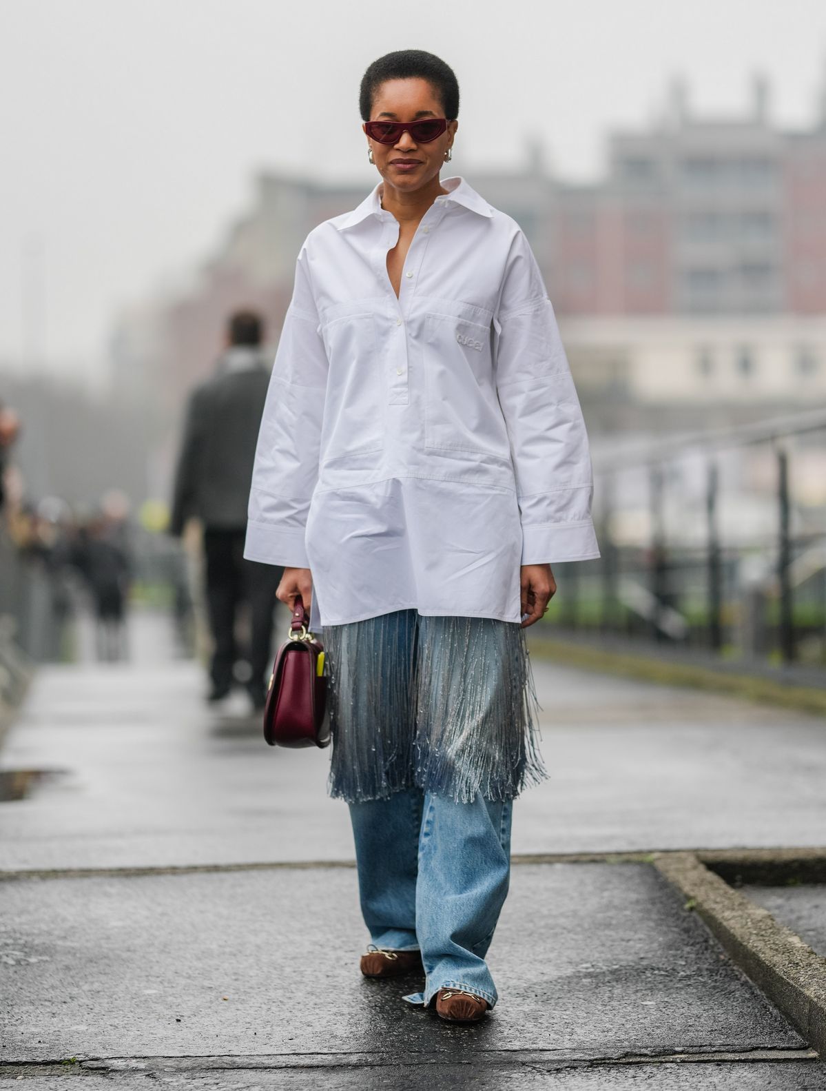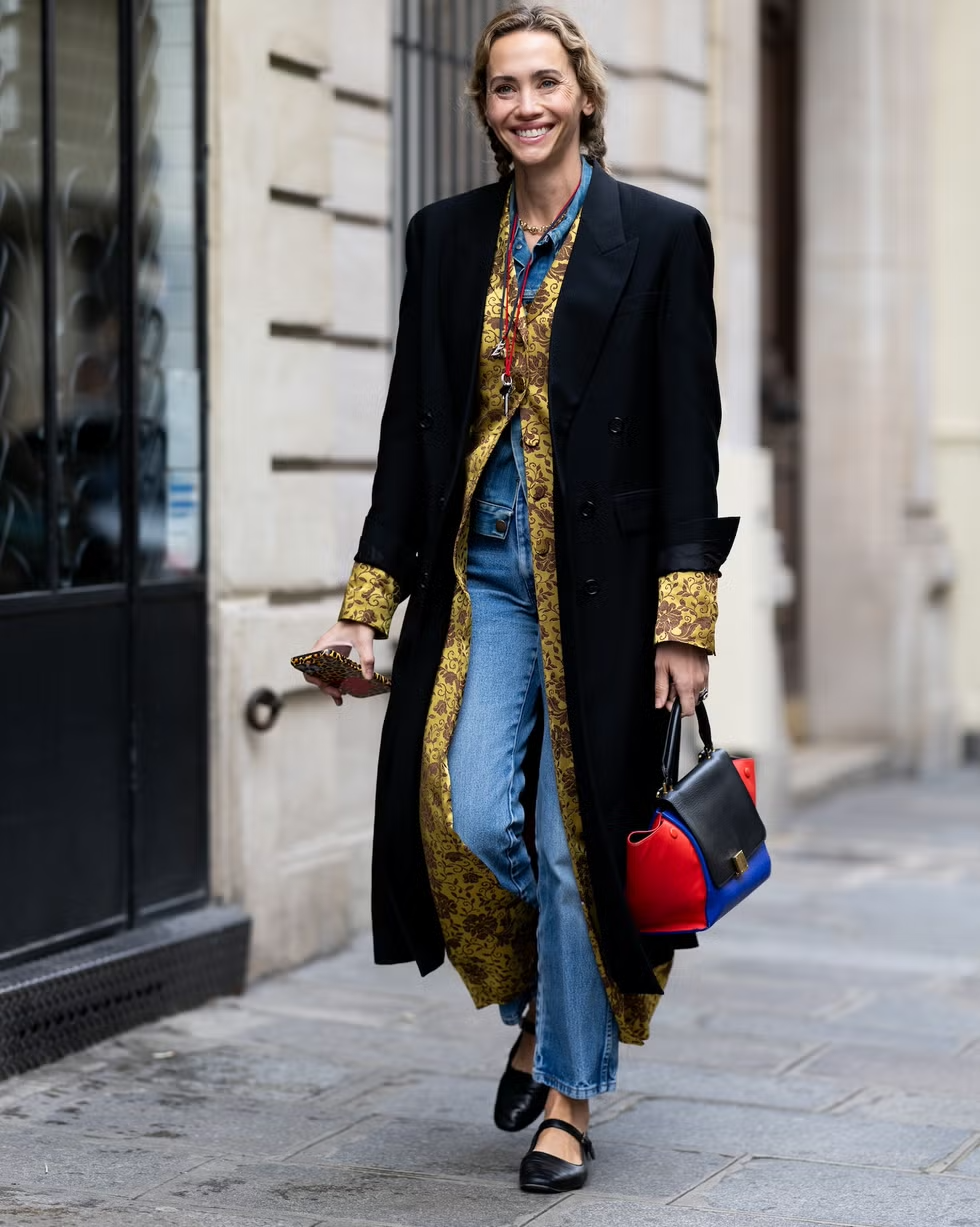 요즘 가장 성공적인 룩들의 공통점은 바로 질감의 대비에 있습니다. 데님 역시 마찬가지입니다. 평범한 니트 대신, 예상 밖의 소재를 더해보세요. 골드 자카드처럼 화려한 원단은 데님과 만나면 오히려 부담스럽지 않게 녹아듭니다. 여기에 큼직한 울 코트를 더하면, 서로 다른 소재들이 만들어내는 긴장감 덕분에 스타일은 한층 입체적으로 보이죠. 단조로운 겨울 데님에 확실한 반전을 주고 싶다면 가장 효과적인 방법입니다.