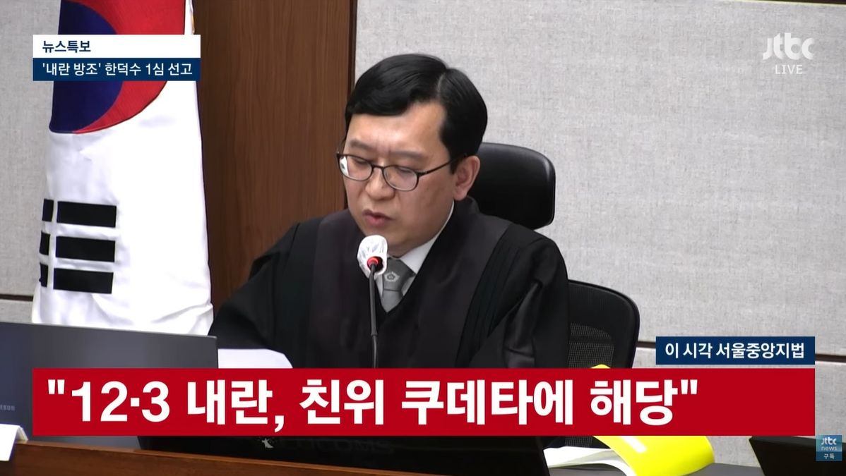법원이 2024년 12월 선포된 비상계엄을 '12.3 내란'이라고 규정했습니다. 이는 내란 우두머리 방조, 내란 주요임무 종사 등의 혐의로 기소된 한덕수 전 국무총리의 1심 판결문에서 나온 말입니다. 서울중앙지법 형사합의33부는 21일 한 전 총리에게 징역 23년을 선고한 직후 증거인멸의 우려가 있다며 법정구속했습니다. 당초 내란 특검팀이 구형한 징역 15년보다 8년을 더한 판결입니다.