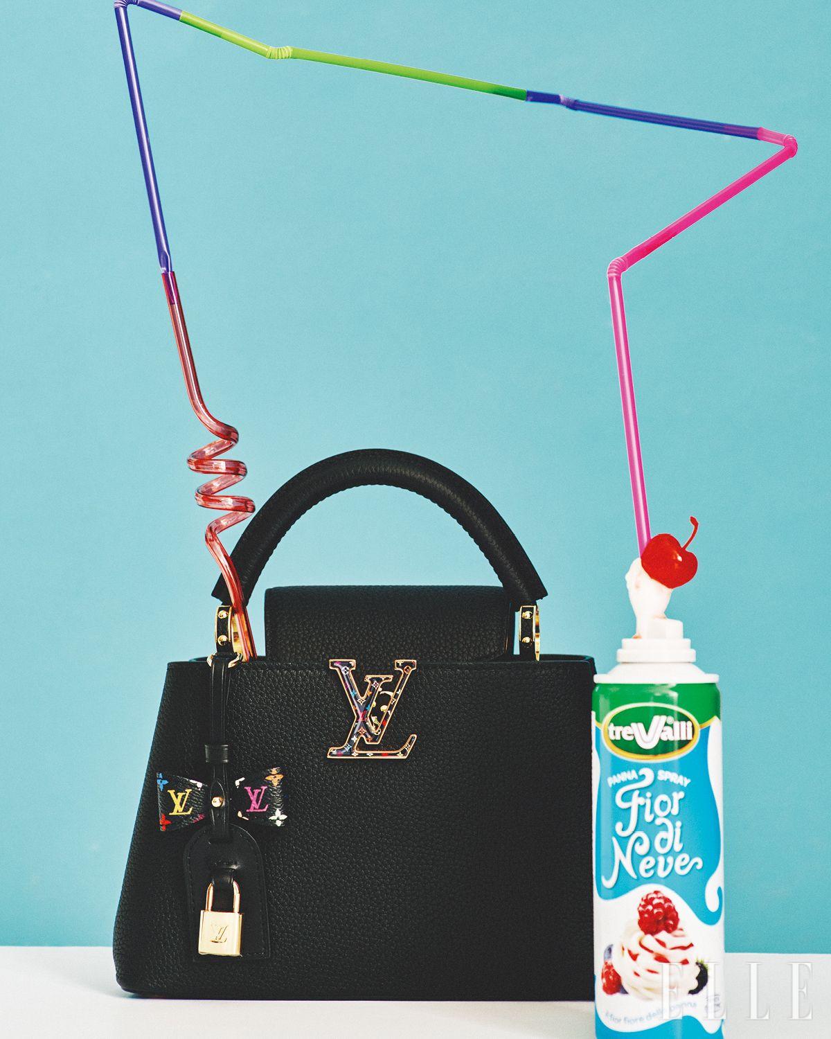 로고 클로저와 리본 백 참에 컬러풀한 모노그램 패턴이 특징인 ‘LV x TM 카퓌신 BB’ 백은 Louis Vuitton.
