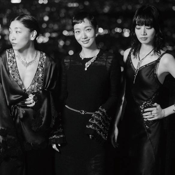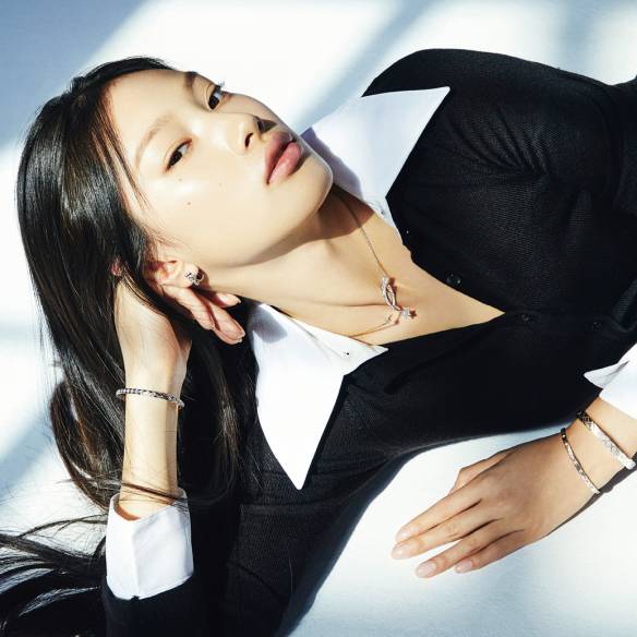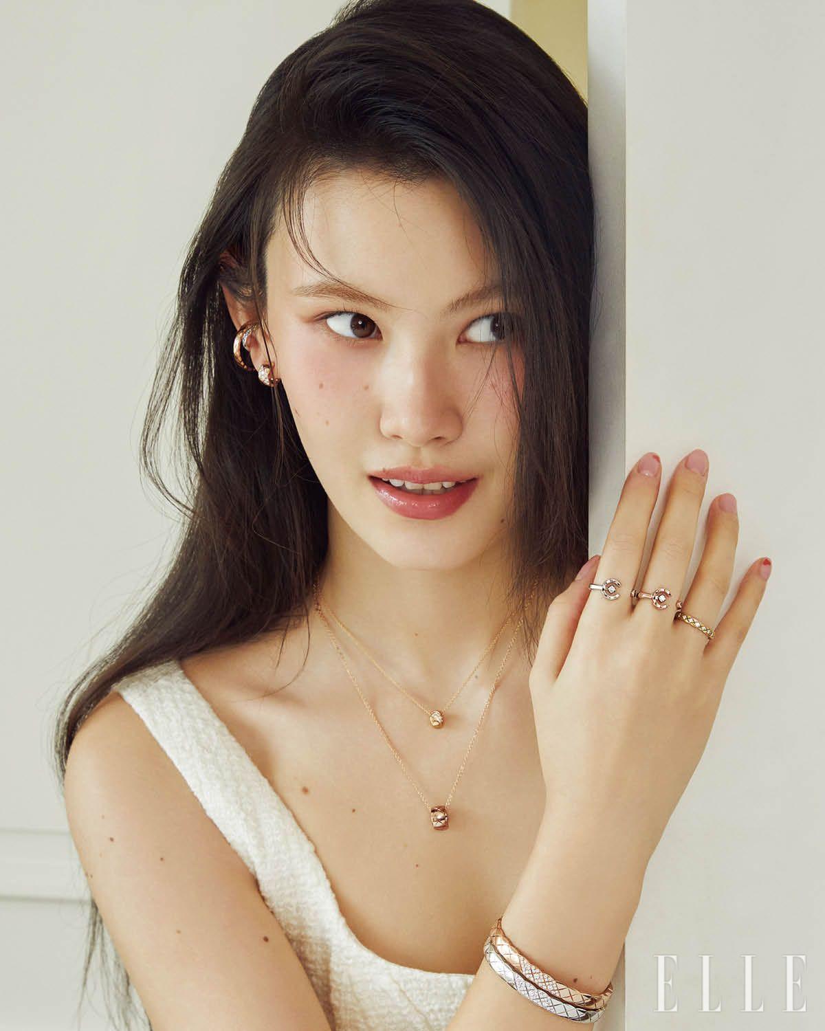 오른쪽 귀에 착용한 18K 베이지골드 코코 크러쉬 싱글 이어링과 18K 베이지골드 코코 크러쉬 이어링, 오른손 검지에 낀 18K 베이지골드 코코 크러쉬 링, 중지에 낀 18K 옐로골드 코코 크러쉬 링, 소지에 낀 18K 화이트골드 코코 크러쉬 스몰 링, 18K 화이트골드 코코 크러쉬 미니 브레이슬릿, 18K 베이지골드 코코 크러쉬 브레이슬릿, 왼쪽 귀에 착용한 18K 베이지골드와 화이트골드 코코 크러쉬 싱글 이어링, 왼손 검지에 낀 18K 화이트골드 코코 크러쉬 링, 중지에 낀 18K 베이지골드 코코 크러쉬 미니 링, 18K 화이트골드 코코 크러쉬 스몰 링, 18K 화이트골드 코코 크러쉬 브레이슬릿은 모두 Chanel Fine Jewelry.