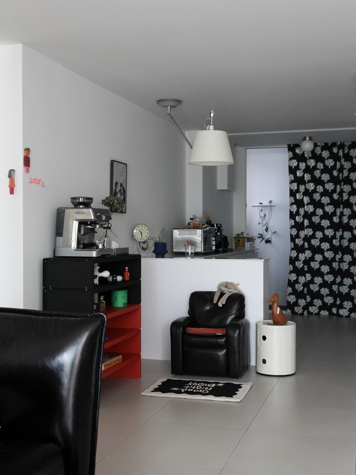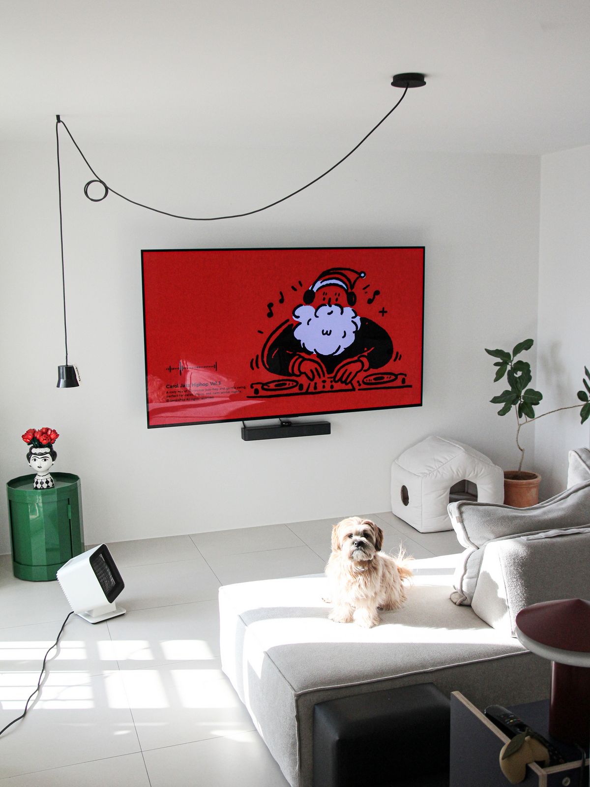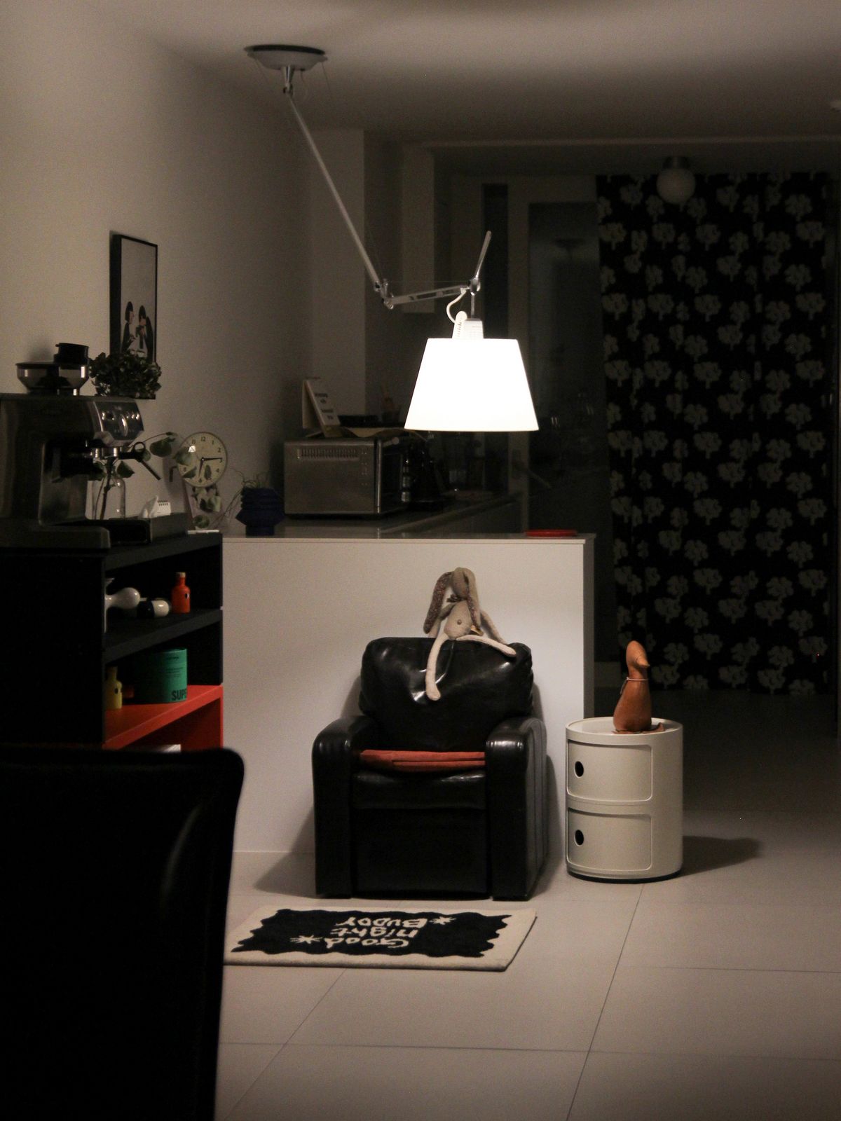 구축 아파트의 안방은 TV룸으로 사용하고 있어요. 이 공간의 중심은 길게 늘어진 아르떼미데의 Gio 펜던트 조명입니다. 방구석 영화관 같은 분위기를 원해 밝지만 확실한 포인트가 되는 조명을 선택했어요. 설치 사례는 많지 않지만, 제가 무척 좋아하는 조명이라 언젠가 집을 다시 짓게 된다면 또 들이고 싶어요.