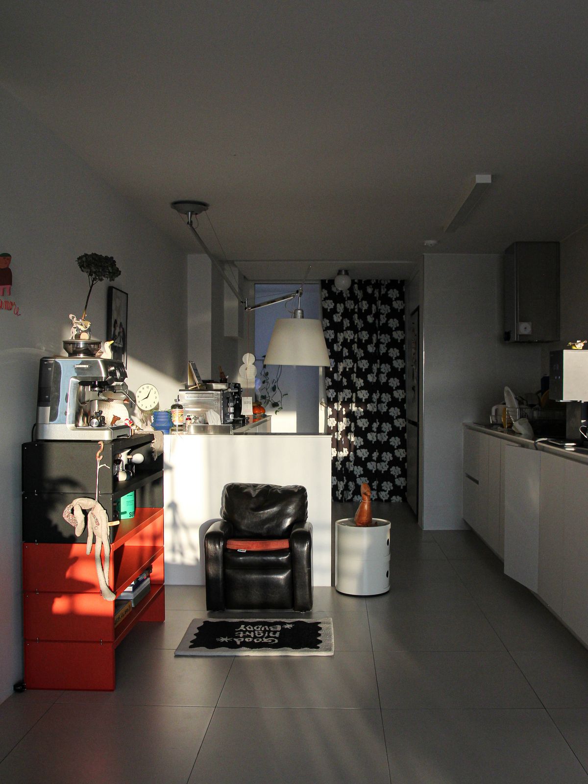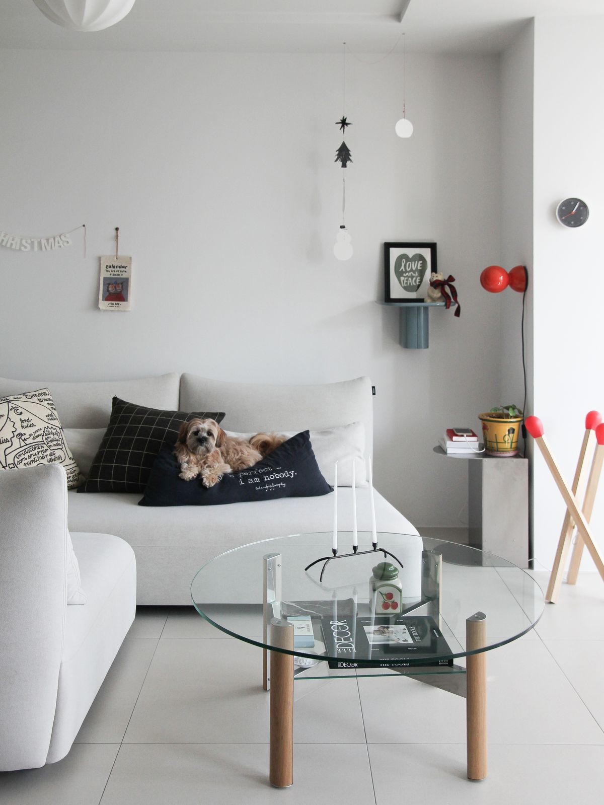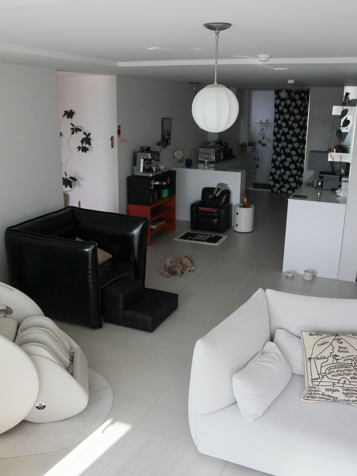 구축 아파트의 안방은 TV룸으로 사용하고 있어요. 이 공간의 중심은 길게 늘어진 아르떼미데의 Gio 펜던트 조명입니다. 방구석 영화관 같은 분위기를 원해 밝지만 확실한 포인트가 되는 조명을 선택했어요. 설치 사례는 많지 않지만, 제가 무척 좋아하는 조명이라 언젠가 집을 다시 짓게 된다면 또 들이고 싶어요.