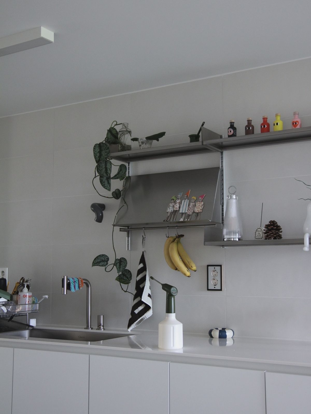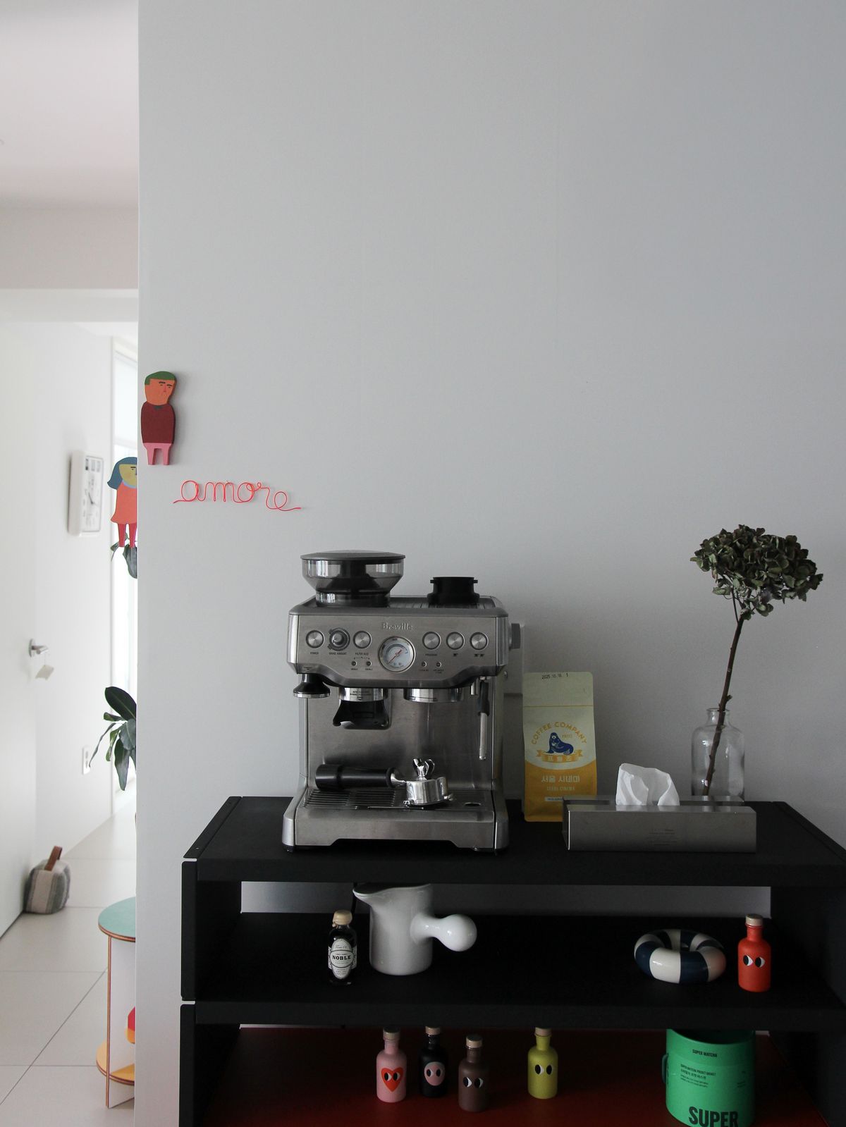 여기에 레어로우의 스테인리스 선반으로 포인트를 더했어요. 머릿속으로 여러 번 시뮬레이션하며 계산해 만든 공간인데, 지금까지 집 안에서 가장 잘한 선택 중 하나라고 생각합니다.
