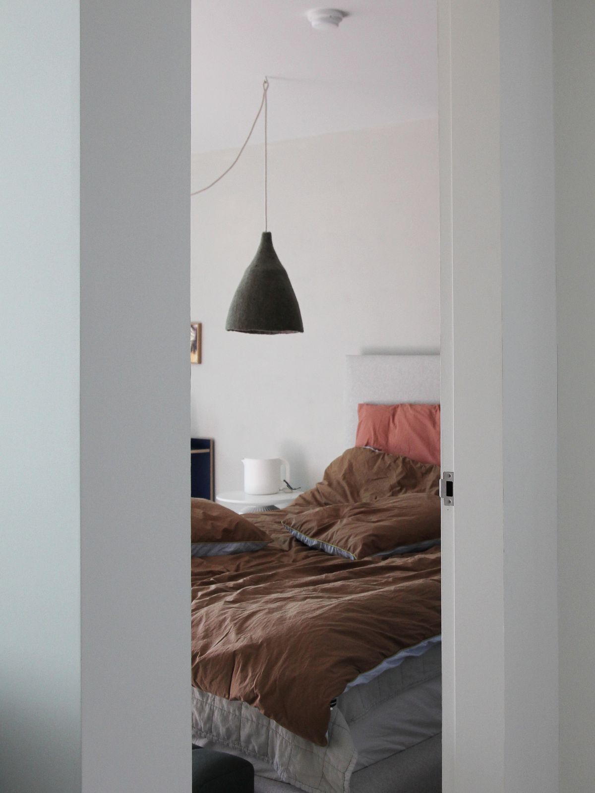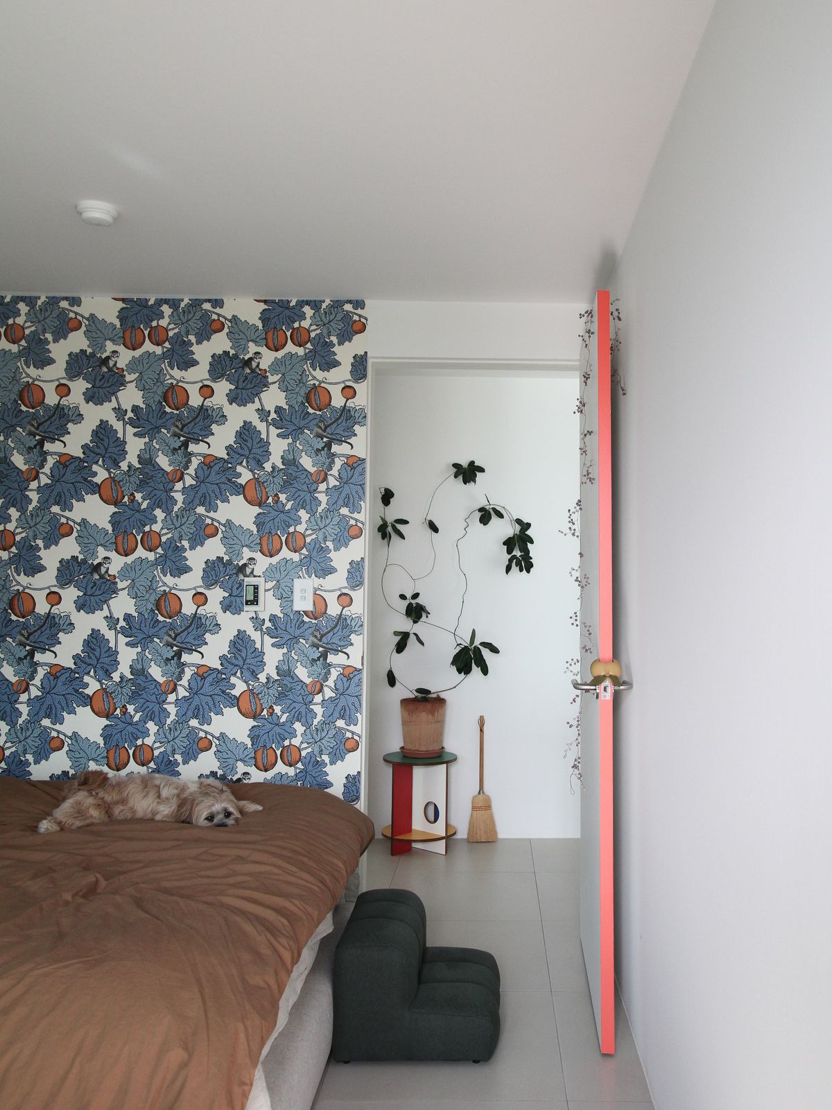 침실은 입구에서 보면 비교적 하얗고 차분한데, 오른쪽으로 시선을 돌리면 화려한 패턴과 컬러의 벽지가 나타나고, 하얀 문의 엣지에는 컬러 포인트를 더했고 머리 위로는 길게 늘어진 펜던트 조명이 자리하고 있어요.