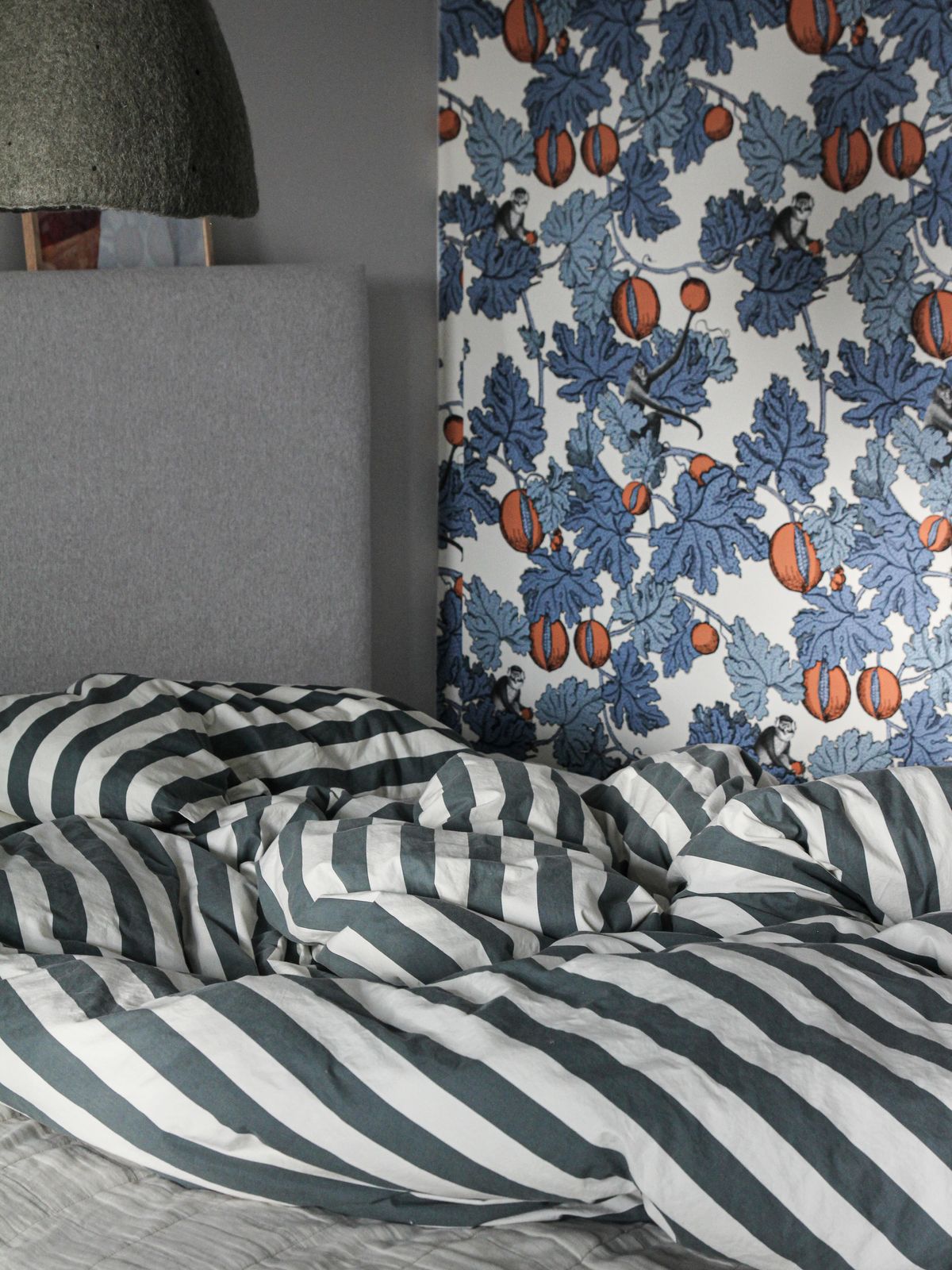보통 ‘방 2’로 불리는 공간을 침실로 사용하고 있어요. 이 방의 포인트는 포르나세티의 화려한 벽지인데, 컬러와 패턴에 반해 1롤에 40만 원 하는 벽지를 망설임 없이 시공했어요. 아주 만족스럽고, 이 집에 오면서 패턴과 컬러를 공간에 담는 일이 더 즐거워졌습니다. 침실은 낮은 조도를 위해 muskhane의 펠트 쉐이드를 선이 늘어지도록 설치했는데, 개인적으로 이런 조명의 선을 참 좋아해요.