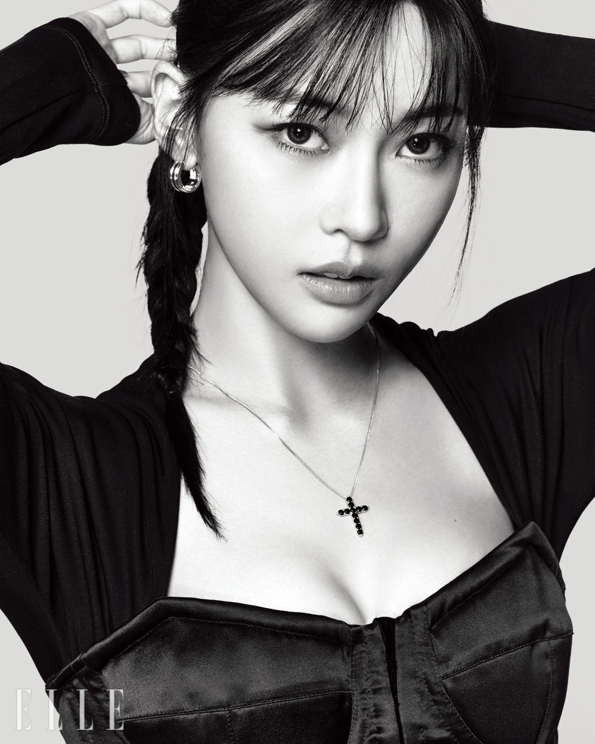 미나수가 입은 원피스는 Maison Margiela. 이어링과 벨트로 활용한 네크리스는 모두 Dolce&Gabbana. 링은 Buccellati.