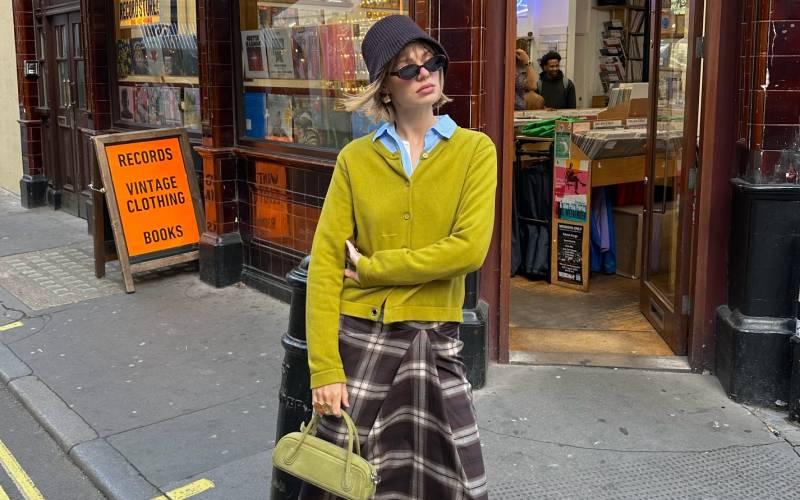 얌전해야 할 것 같은 길이의 블랙 치마인데, 허벅지까지 과감하게 올라간 슬릿 덕분에 분위기가 단번에 바뀌죠. 상의는 오버사이즈 집업 후디 안에 그린 컬러를 레이어드해 포인트를 줬어요. 상체는 부피감 있게, 하체는 길고 날렵하게. 부츠가 아닌 양말과 힐 조합을 선택해 슬릿 사이로 드러나는 다리 라인을 더 강조했죠. 미디스커트라고 얌전히 타협하지 마세요. 슬릿이나 지퍼처럼 긴장감 있는 디테일을 고르고, 후디나 스웨트셔츠로 가벼움을 주면 됩니다. 단, 신발은 반드시 길게. 그래야 이 작은 도발이 더욱 재미있어지니까요.