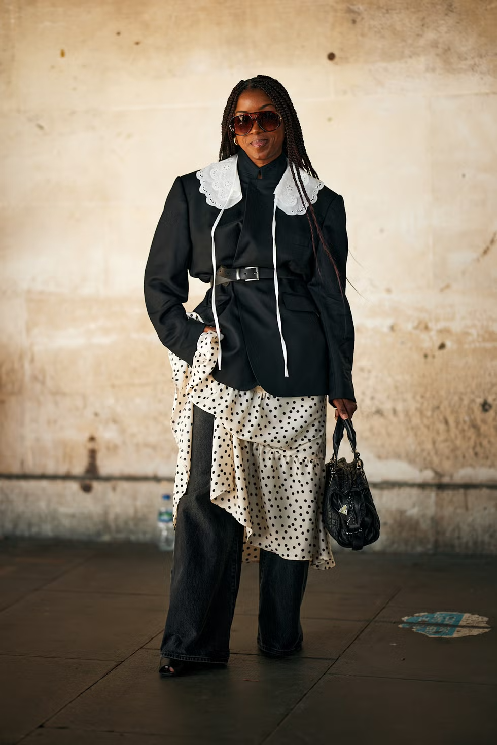 런던 패션위크에서는 폴카 도트 드레스와 배기 진이라는 새로운 레이어링이 포착됐습니다. 벨트 재킷으로 허리를 정리해 실루엣을 다듬는 일도 잊지 않았죠. 드레스와 데님의 조합은 더 이상 낯설지 않습니다. 오히려 가장 동시대적인 선택에 가깝죠.