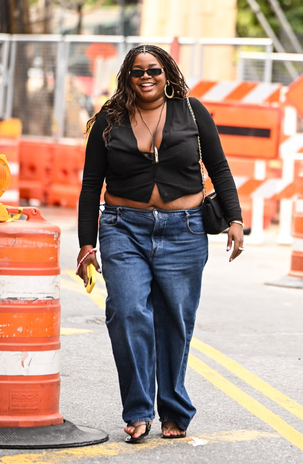 가브리엘라 카레파 존슨은 블랙 카디건과 코드 네크리스, 힐 플립플롭을 더해 쿨한 도시적 무드를 완성했습니다. 배기 진은 바닥에 질질 끌리는 대신, 발목에서 자연스럽게 슬라우치되도록 연출했습니다. 여기에 싱글 브레스트 블레이저나 카 코트를 더하면 간절기까지 이어지는 데일리 룩이 완성됩니다.