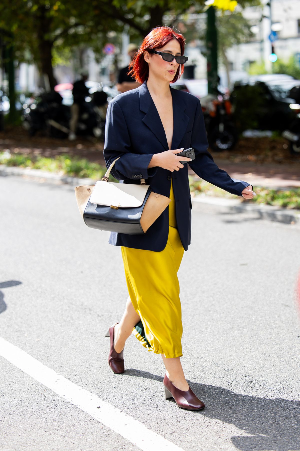 네이비가 진가를 발휘하는 순간은 강렬한 색을 만났을 때입니다. 올 시즌 주목받는 샤트뢰즈나 버건디는 네이비와 특히 완벽한 궁합을 자랑합니다. 어두운 블루 테일러링 위에 새틴 스커트를 더하면, 대담한 색도 한층 고급스럽게 정돈되죠. 강한 컬러가 부담스러웠다면 네이비를 방패 삼아 보세요. 전체 룩을 차분히 붙잡아주기 때문에 실패 확률이 현저히 낮아지죠. 과감하지만 우아한 균형이 핵심입니다.