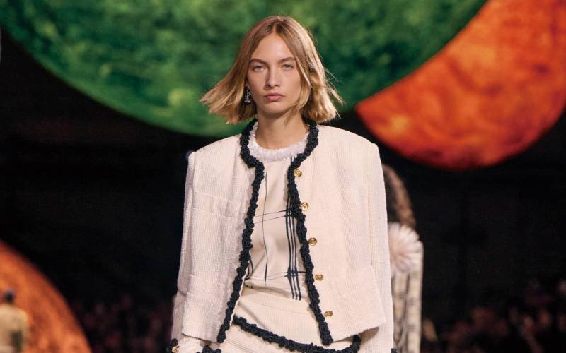남성의 전유물로 여겨지던 쿼터집 스웨터가 샤넬 공방 컬렉션에서 돋보일 수 있었던 건 여성스러운 터치가 가미된 가방과 슈즈 덕분입니다. 머리부터 발끝까지 매니시한 아이템으로만 무장하면 한순간에 지루한 룩이 되어 버릴 수 있다는 사실을 잘 아는 모델 아리하라 미유키는 리본 디테일이 볼드한게 들어간 클러치로 귀여운 감성을 한 스푼 더했네요.
