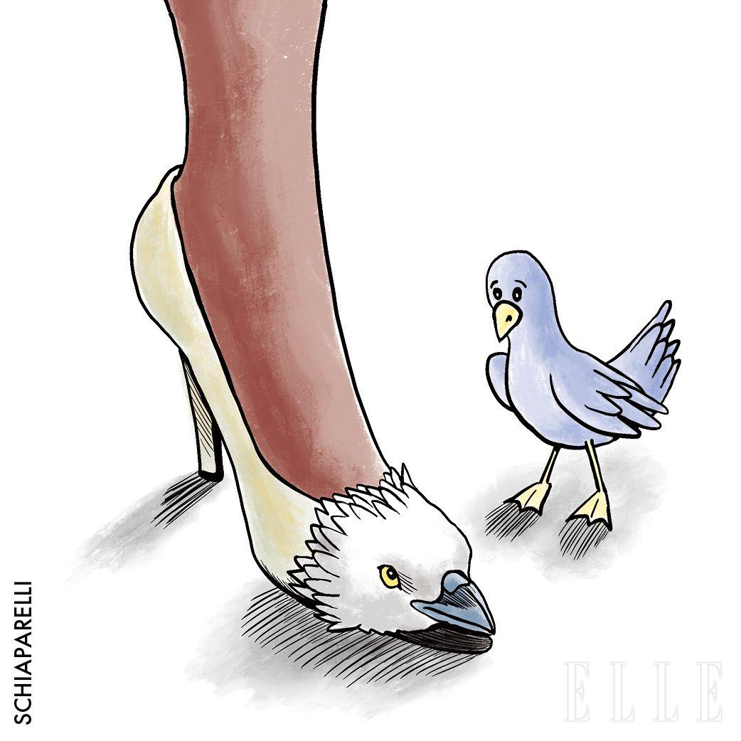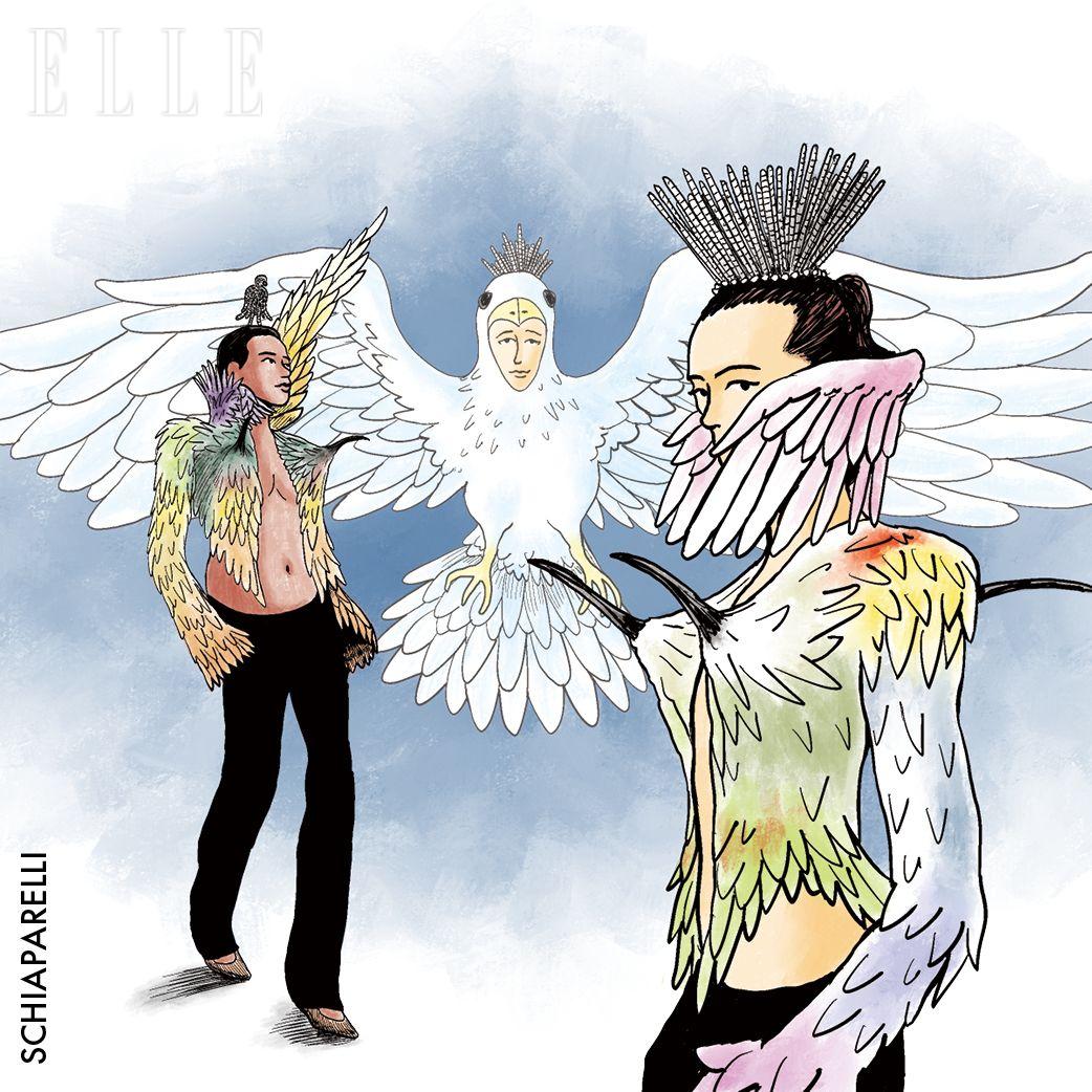」스키아파렐리의 모델들은 완전히 새로운 모습으로 변신해 강렬한 인상을 남겼다. 그것도 인간과 새의 경계에 머문, 극도로 사실적인 새의 형상으로 말이다. 촘촘한 깃털이 드레스와 재킷 위를 뒤덮었고, 새의 발톱은 가슴과 등에서 튀어나왔다. 기괴하면서도 아름다운, 초현실적인 새 무리의 향연.