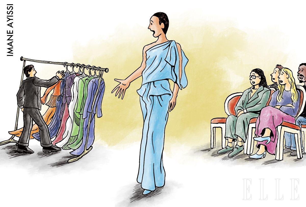 」이마네 아이시의 쇼장 한쪽 벽에는 가지런히 걸린 컬렉션 룩 옆으로 테일러와 가운 차림의 모델들이 서 있었다. 모델들은 테일러와 함께 옷을 갈아입고 그대로 런웨이에 올랐다. 묵직한 옷 부피에 짓눌려 위태롭게 버티던 행거는 결국 힘을 잃고 쓰러졌다. 다행히도 쇼는 무사히 끝났다.