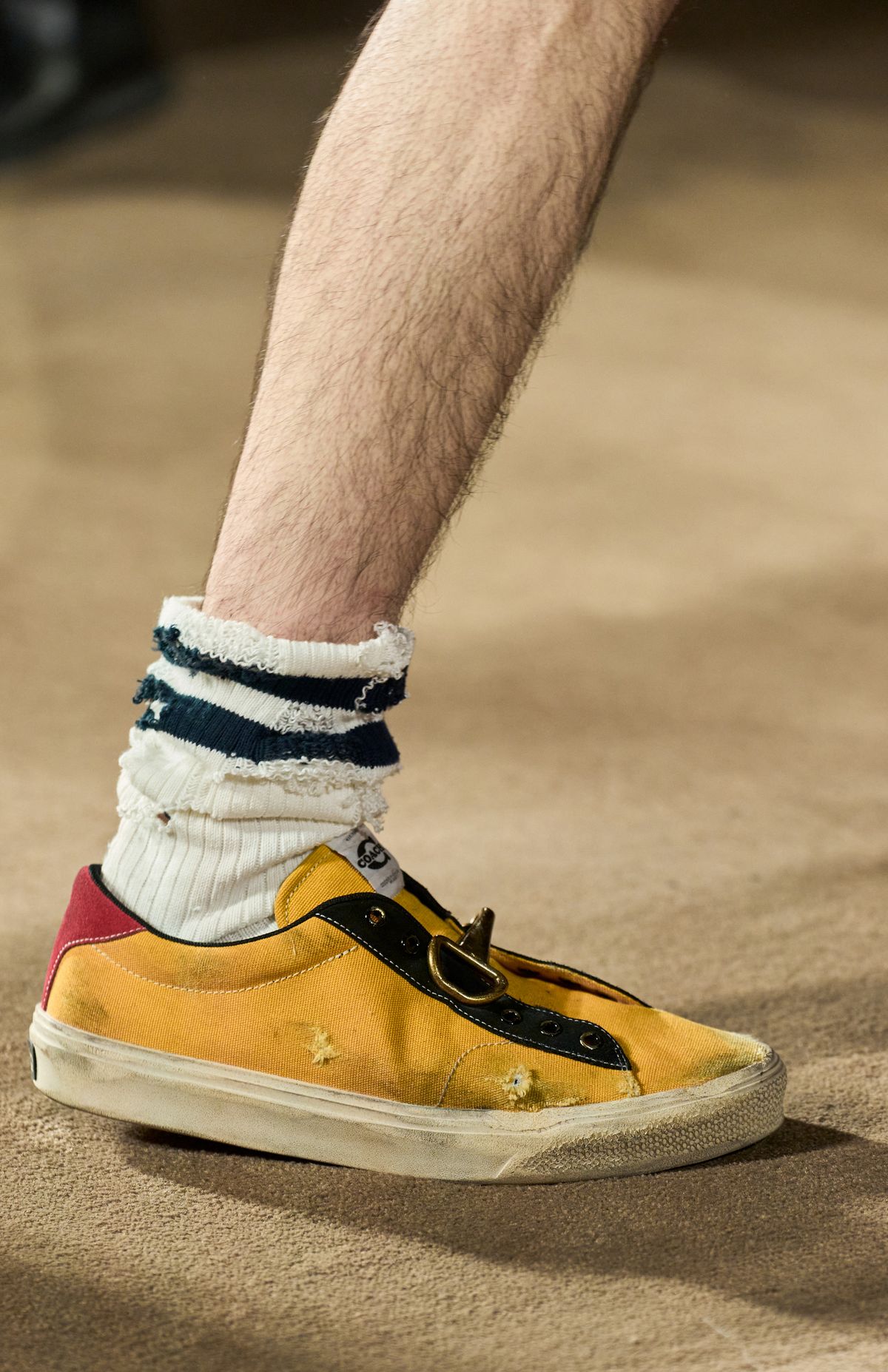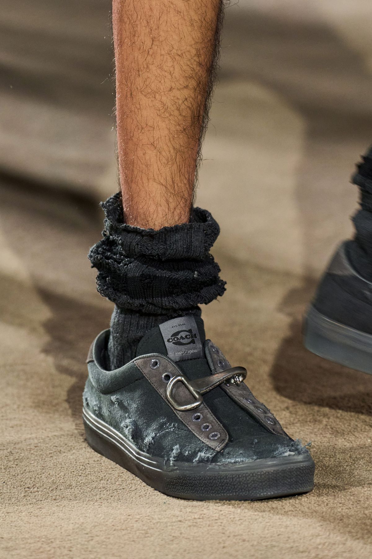 슈즈에서는 레이스 없이 완성된 ‘코치 스케이트 스니커즈(Coach Skate Sneakers)’가 주목할 만하다. 70년대 스웨이드와 캔버스에서 영감을 받아, 모노톤부터 대비 컬러까지 폭넓은 팔레트로 구성됐다. 하드웨어 클립이 시그니처 디테일로 자리한다. 액세서리는 별·달·태양의 천체 모티프가 중심. 골드와 실버 톤의 이어링과 브로치, 타이거아이 시그넷 링이 체인 목걸이로 변주된다. 컬러풀한 레더 벨트, 바시티 스트라이프 삭스, 얇은 실버 프레임 안경이 룩을 마무리한다.