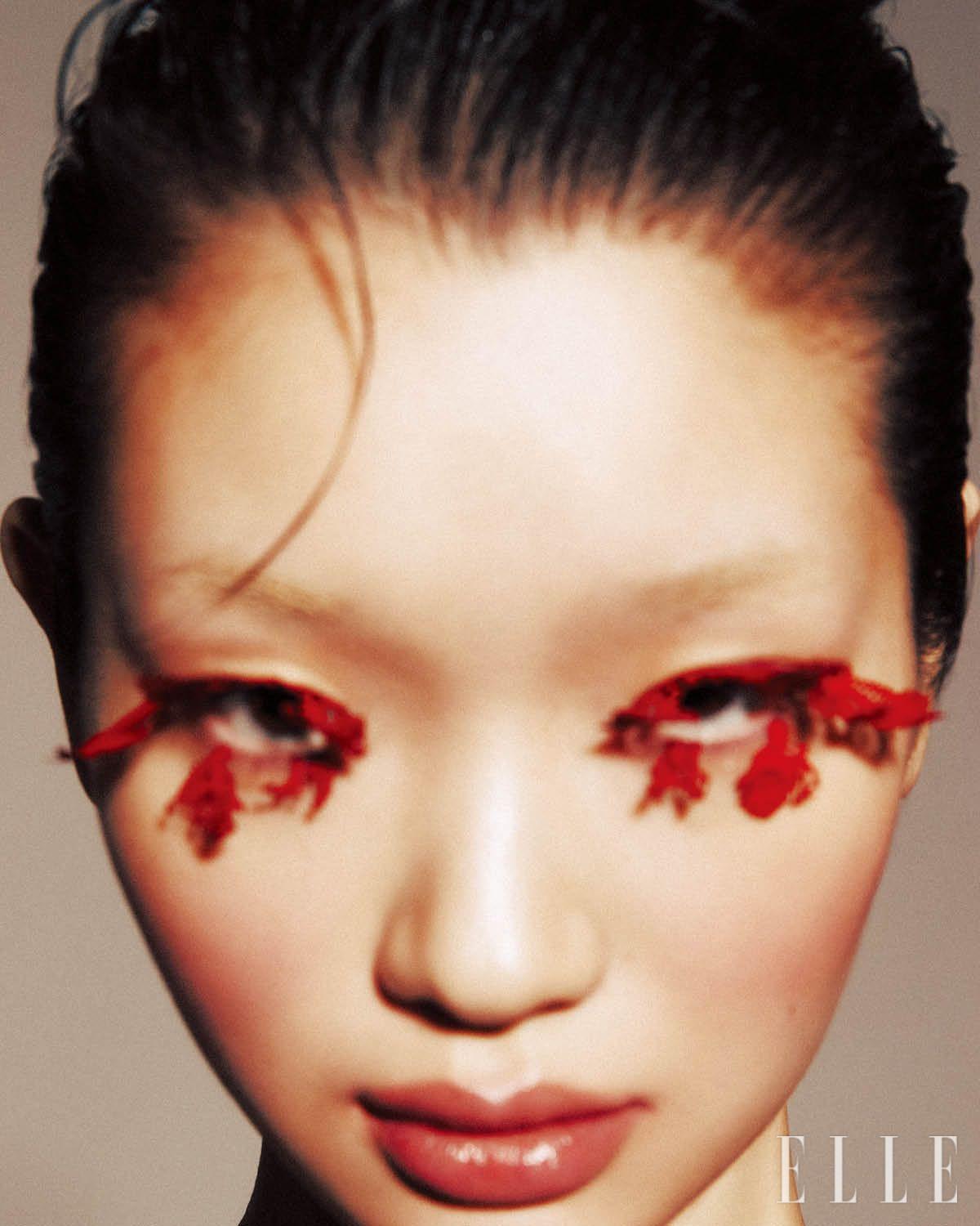 」흐린 포커스 사이로 눈가를 장악한 레드 텍스처가 단번에 시선을 빼앗는 아이래시. Sulwhasoo 퍼펙팅 틴티드 크림, 1호로 피부를 매끈하게 정돈한 후 Guerlain 테라코타 블러쉬, 00 라이트 누드를 눈두덩과 볼, 턱 끝에 가볍게 터치한다. 꽃과 나비를 상상하며 종이로 만든 레드 컬러 오브제를 속눈썹에 부착해 시각적 임팩트를 극대화한다.