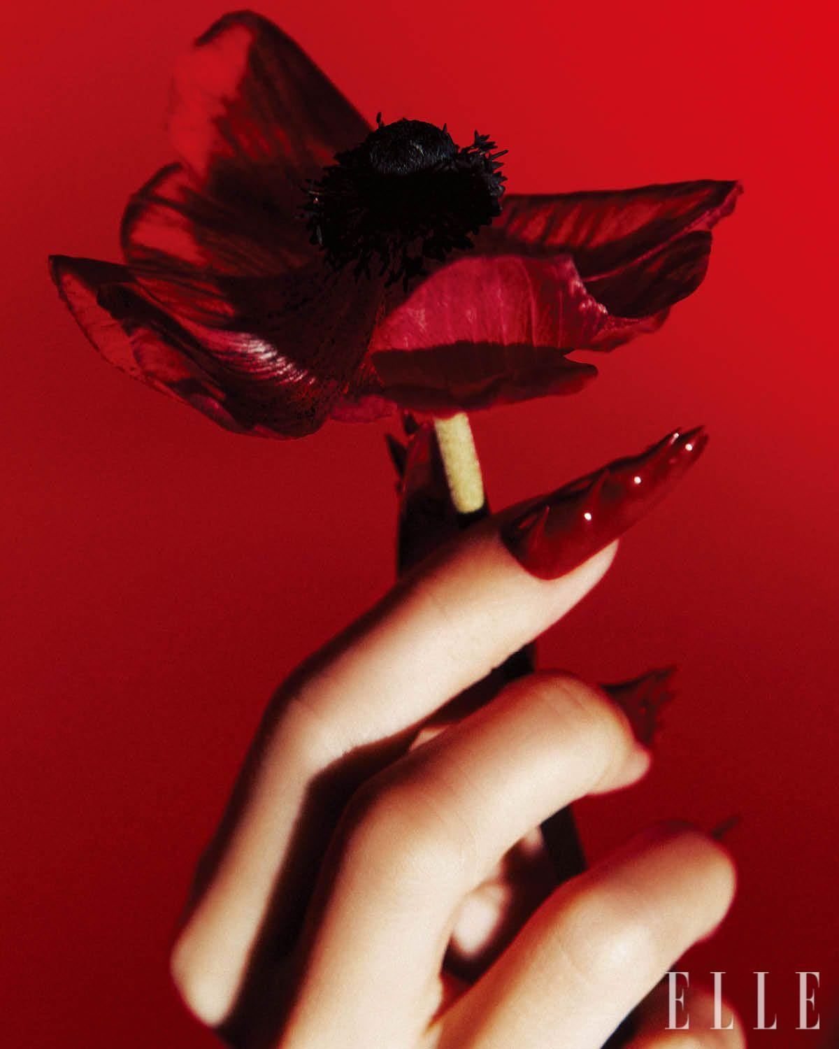 」한 떨기의 붉은 꽃 아래, 가시처럼 돋아난 네일 아트. 아찔한 스틸레토 셰이프의 손톱 위에 글로시한 레드 젤 네일을 도톰하게 얹고 뾰족한 가시 모양의 오브제를 부착한 뒤, 다시 컬러를 덧칠해 날 선 존재감을 완성한다.
