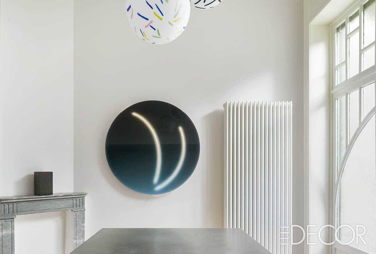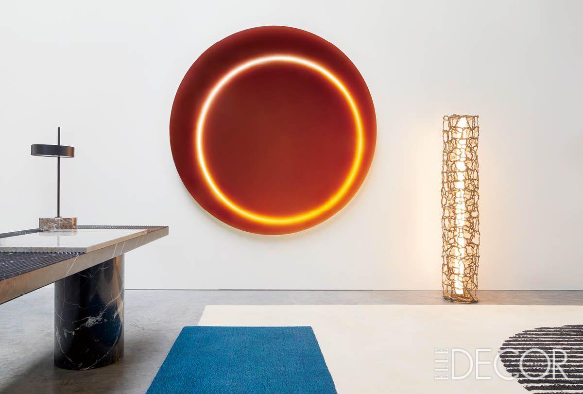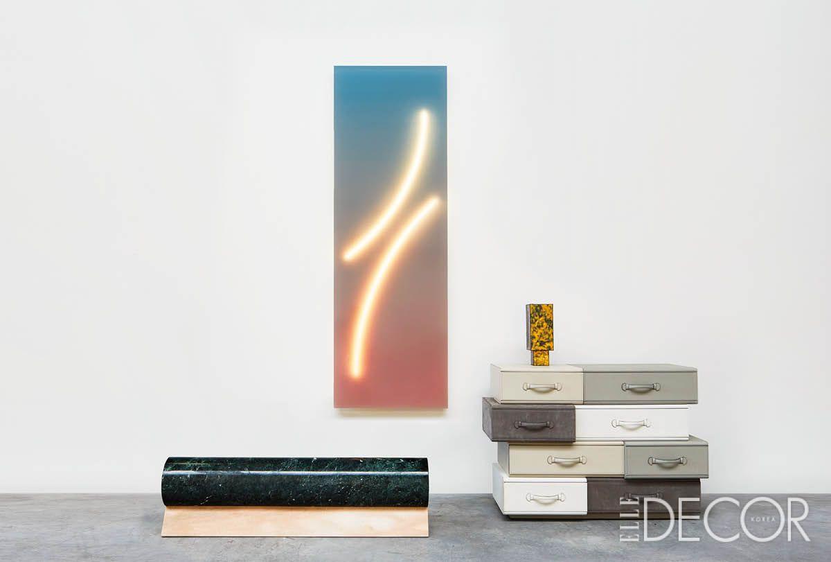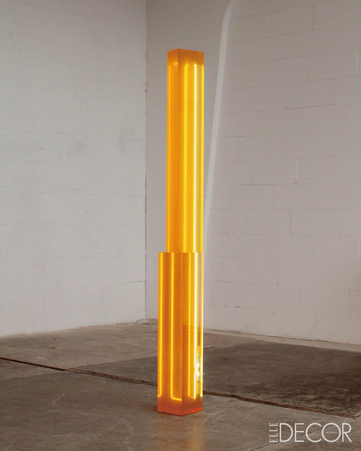 그러데이션된 컬러 레진은 캔버스, 그 위의 네온은 붓질을 연상시키는 조명 오브제 ‘Down Lights’.