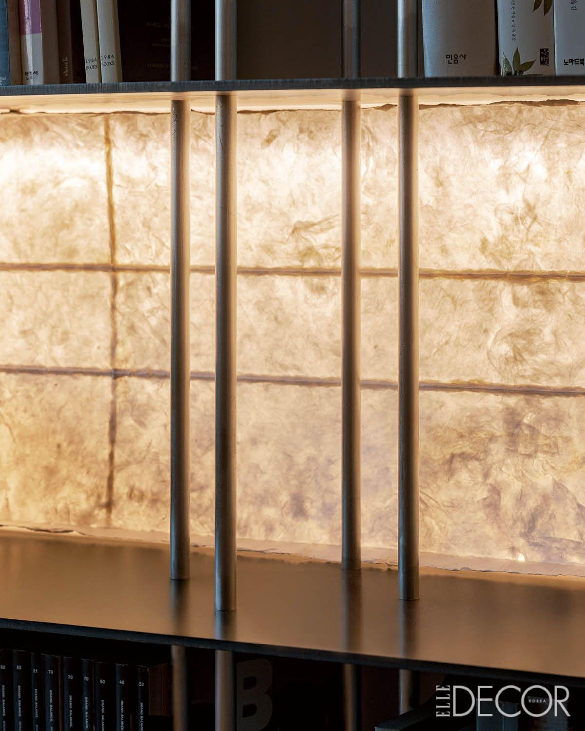 회색 도장이 아닌 실버를 선택한 이유는 명확하다. 빛을 받았을 때 금속의 경계가 번지며 프레임이 시각적으로 사라지는 효과를 노린 것이다. 은은하게 스며드는 북서쪽의 빛이 메탈릭 실버 프레임에 닿아 경계를 무너뜨릴 때, 창은 도시 풍경을 집 안으로 삼투시키는 유연한 막이 된다. 빛에 대한 예민한 감각은 조명 계획에서도 두드러진다. 어릴 적 바닥에 누워 바라보던 거실 천장의 형광등이 괴로웠다는 그는 기능적인 다운 라이트를 최소화하고 대신 한지와 유리를 활용한 간접조명을 고안했다. 특히 서재와 거실 곳곳에 쓰인 한지 조명은 합판에 V자 코팅을 하고 한지를 발라 말리는 실험적 방식을 선택했다. 별도의 구조체 없이도 한지 스스로 형태를 유지하며 빛을 포근하게 머금는 이 디테일은 공예에 대한 그의 깊은 애정을 보여준다. 대량생산된 주거 시설인 아파트의 규격화된 층고나 매끄러운 벽면에서 개인의 감각은 자주 거세된다. 박성민 소장이 이 건조한 상자에 공예적 디테일을 심은 이유일 것이다.
