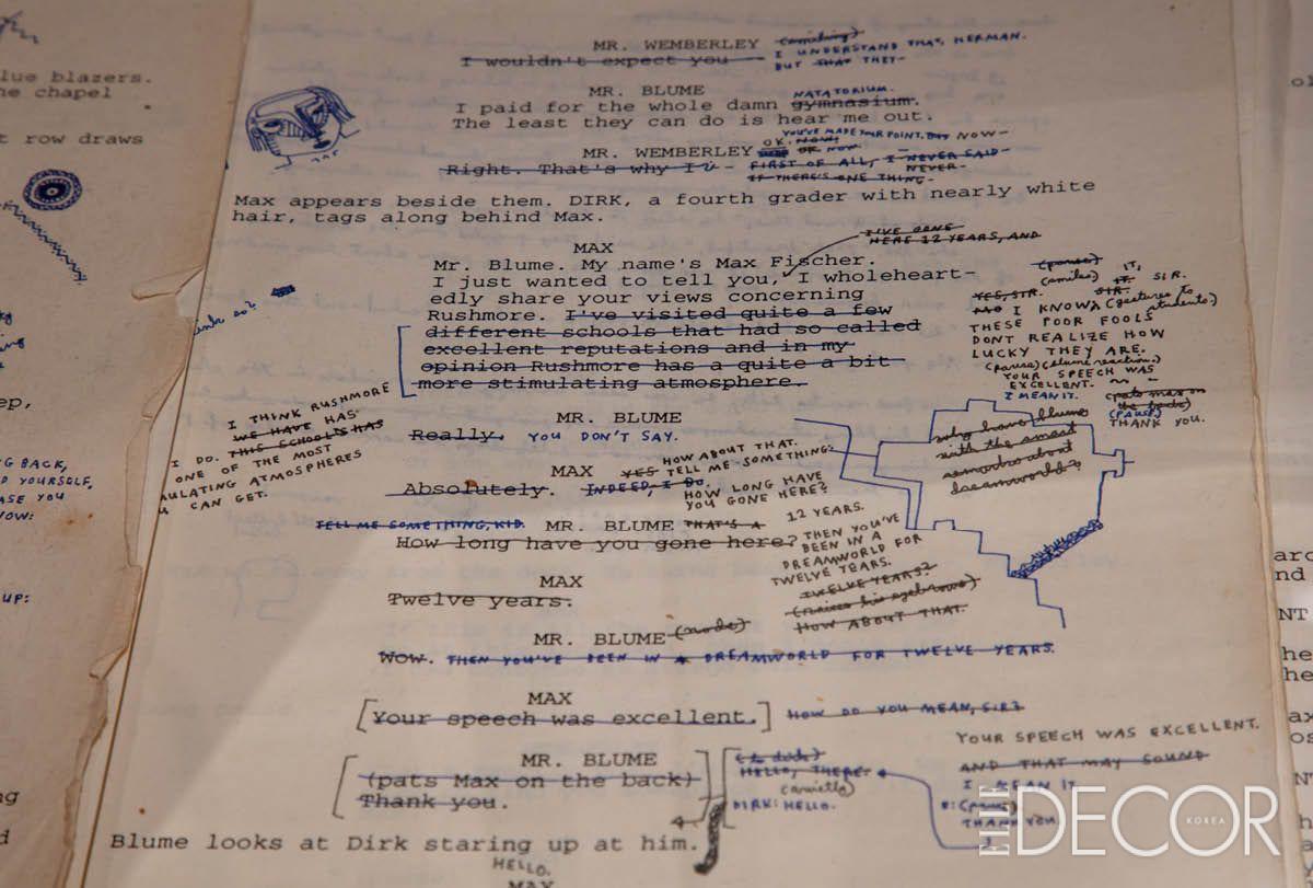 전시에선 웨스 앤더슨이 영화 작업을 위해 집요하게 기록해 온 노트도 공개됐다. 캐릭터의 세밀한 습관부터 공간 색감까지 기록된 아카이브는 그의 독보적인 시각 문법이 철저한 설계에서 탄생했음을 보여준다. 자신이 창조한 소우주 속 퍼펫 모형을 응시하는 웨스 앤더슨.