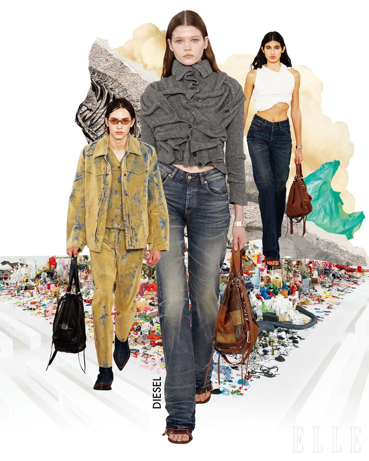 디젤 쇼는 요란하고 강렬했다. 50년 가까이 축적된 소품과 오브제가 쇼장에 나열됐다. 자그마치 5만 점. 이는 창의적 업사이클링에 대한 약속이자 디젤이 탐닉한 파티 역사의 축소판에 가까웠다. 그 공간에서 글렌 마틴스는 ‘파티 다음날 아침’의 룩을 선보였다. 영구적 주름의 데님과 비틀린 실루엣의 옷들이 소리 없이 외쳤다. 디젤 특유의 반항적인 미학과 에너지는 나이를 먹지 않는다고.