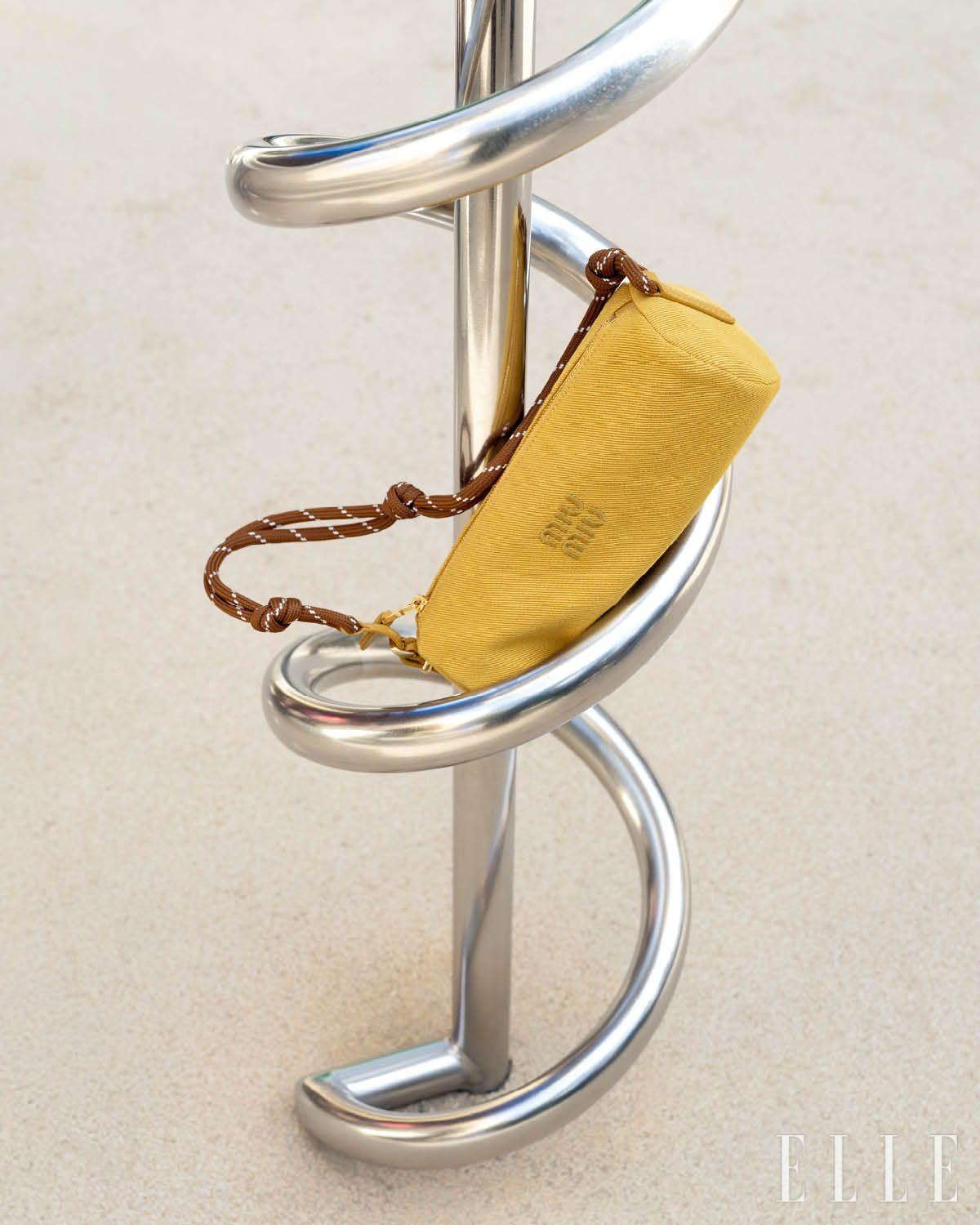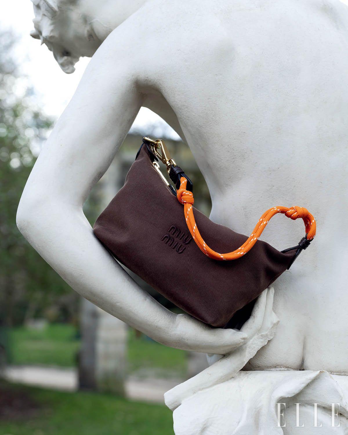 유틸리테어 스웨이드 숄더백과 블루 셔츠 모양의 레더 트릭은 모두 Miu Miu.