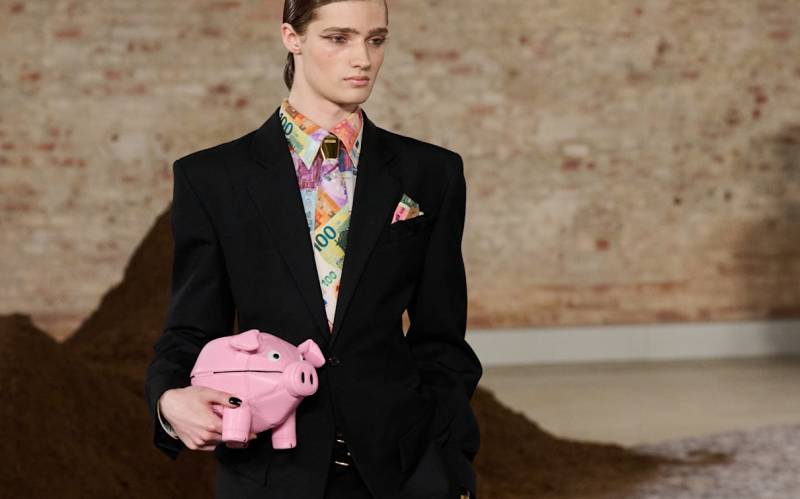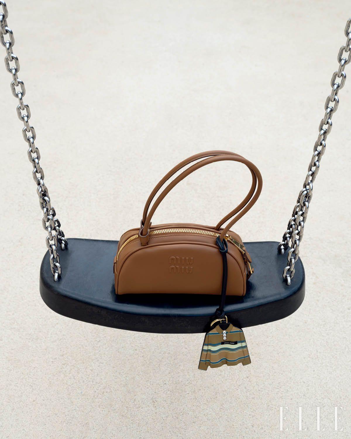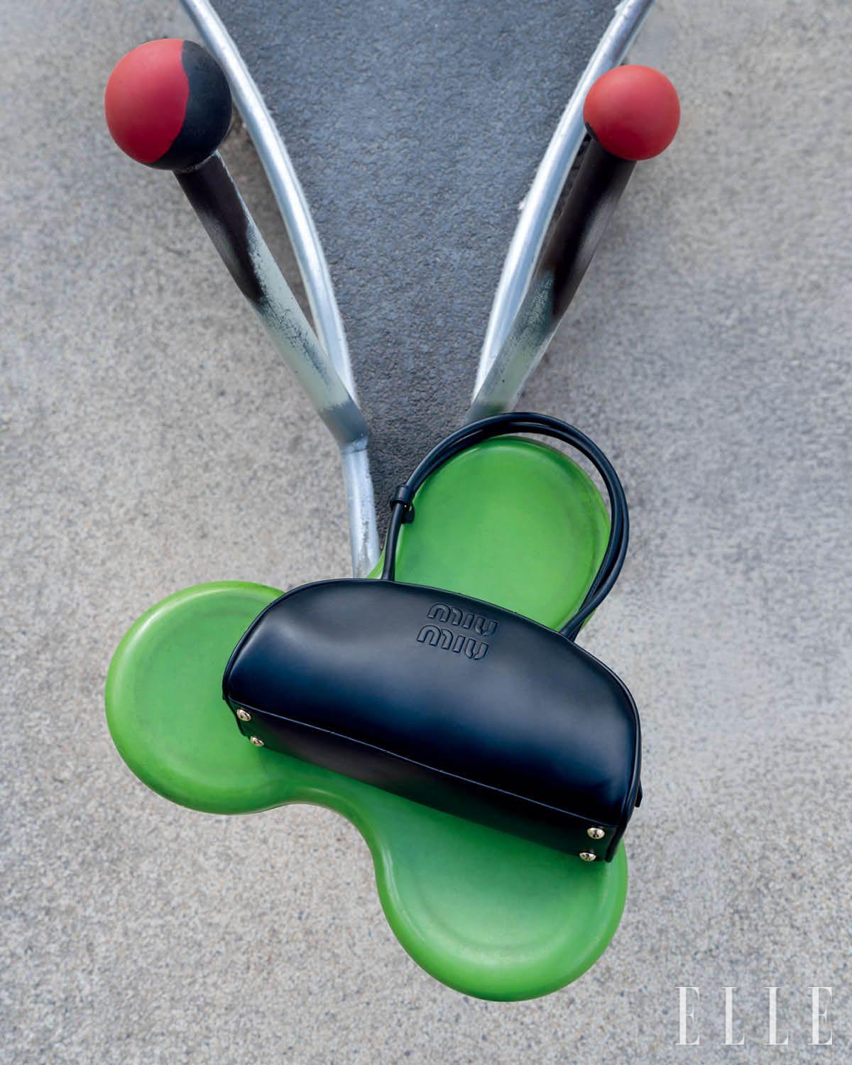 볼링 백 형태의 레더 보 백, 스트라이프 셔츠 모양의 레더 트릭은 모두 Miu Miu.