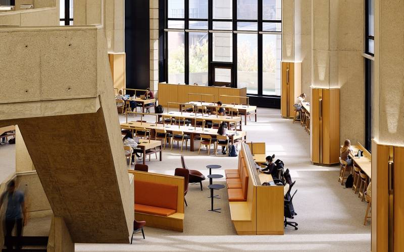 서가가 중심이 되는 큰 공간. 황동 디테일은 원래 사용된 소재에 대한 은근한 오마주다. 찰스 & 레이 임스가 디자인한 비트라(Vitra) 라운지체어가 공간에 임팩트를 더한다.