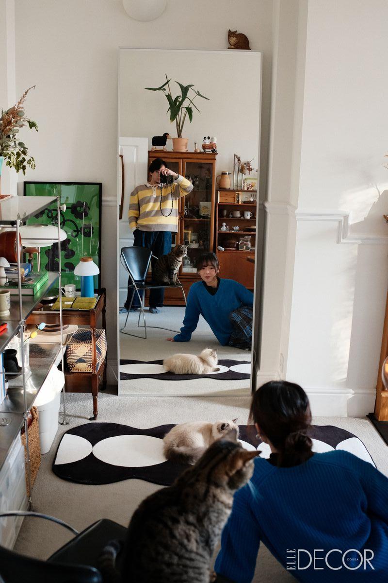 런던 서부의 조용한 주거 지역에 자리한 1900년대에 지어진 플랫에 세 들어 살고 있어요. 집 건물은 오래된 에드워디안(Edwardian) 양식의 특징을 갖고 있는데, 앤티크 벽난로와 높은 천장, 커다란 퇴창(건물 외벽에서 바깥으로 살짝 튀어나오게 만든 창)이 인상적이에요. 근처에는 아름다운 공원이 있어요. 창문이 공원 입구와 작은 갤러리 쪽으로 난 점이 좋아요. 하루 동안 빛이 어떻게 변하는지 자연스레 알 수 있죠. 고양이들도 이 창가에서 바깥을 관찰하며 오래도록 시간을 보내요. 임대 주택이기 때문에 구조를 바꿀 수는 없었어요. 이미 정해진 것들과 새로운 것의 조화를 생각하며 공간을 만들어 갔죠. 물건을 하나씩 들이며 천천히 형태를 갖췄고 계절에 따라 배치를 바꾸고 있어요. 빛에 따라 공간이 자연스레 변화하도록 말이죠.